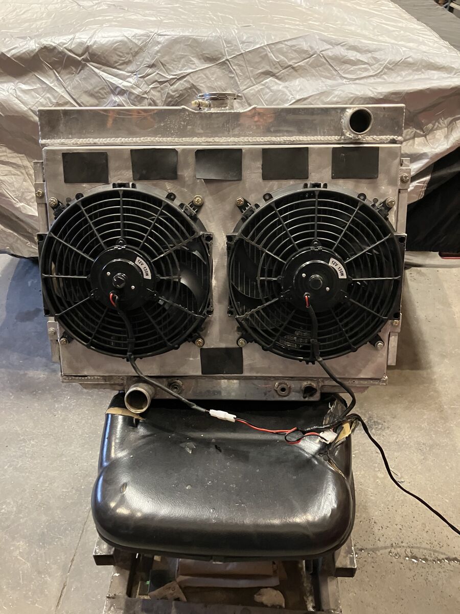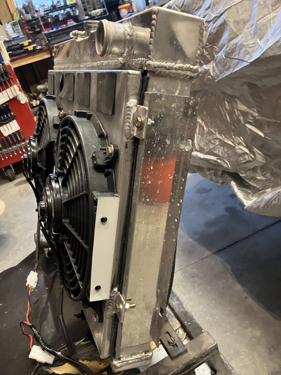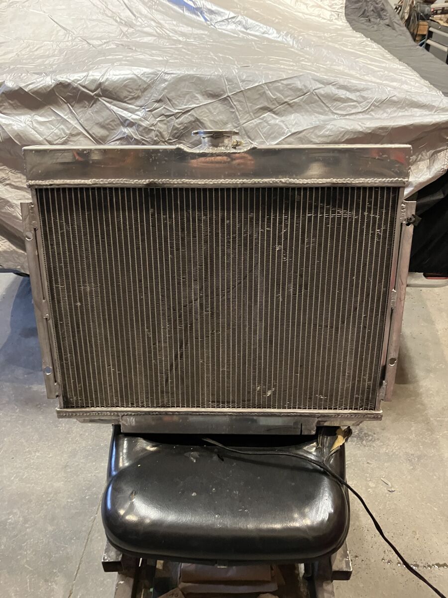 USED ALUM RADIATOR AND DUAL ELECTRIC FAN set up Radiator Core approx 16-1/2 tall x 24 wide 3 cores 1-1/2 inlet (pass side lower 1-3/4 outlet (driver side) comes with 2 - 12 inch electric fans and shroud included, has bypass flaps in shroud