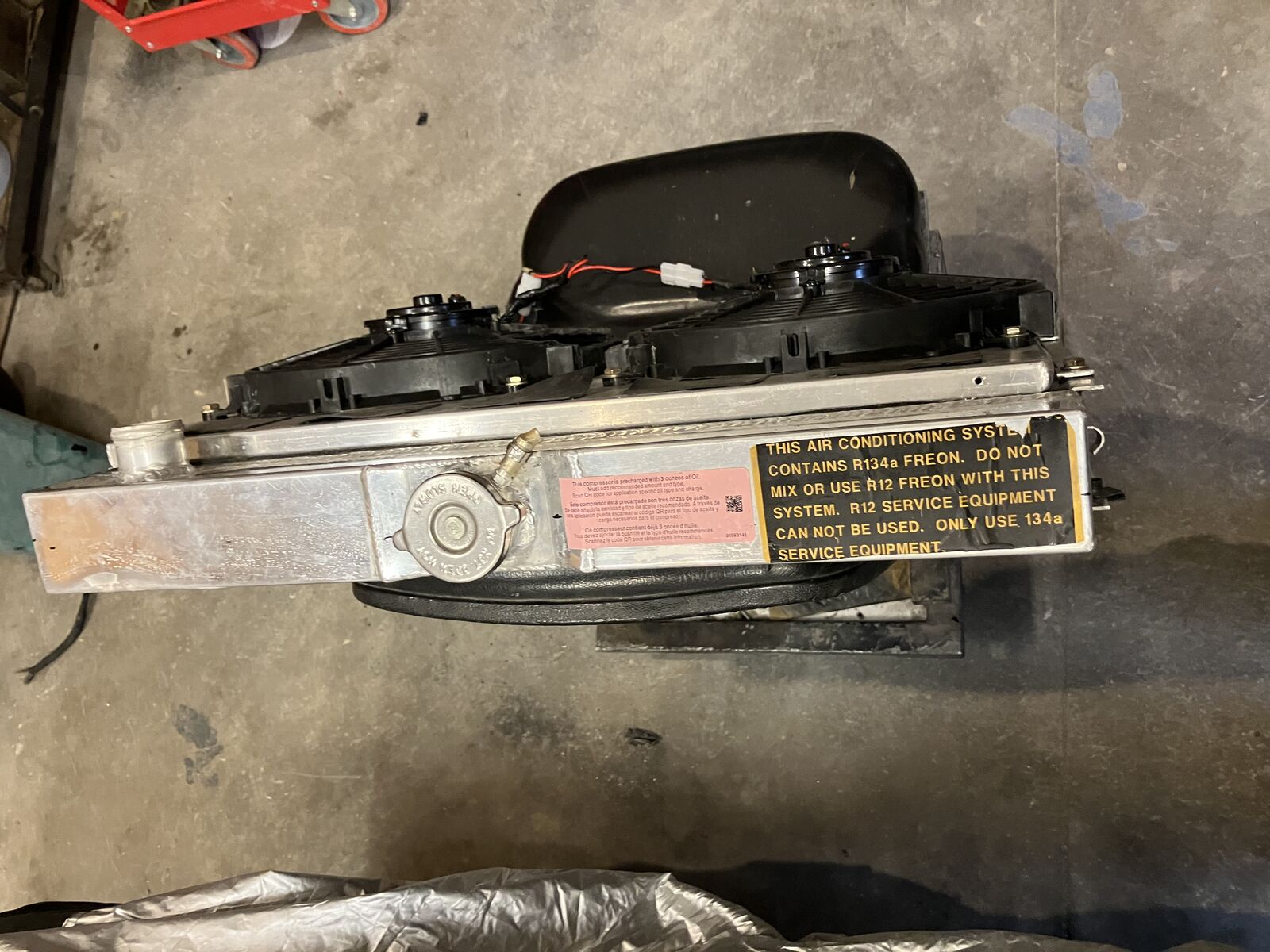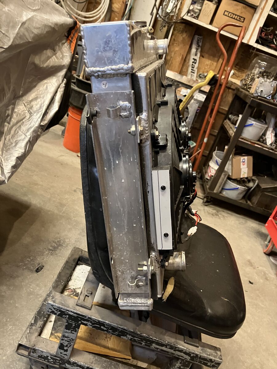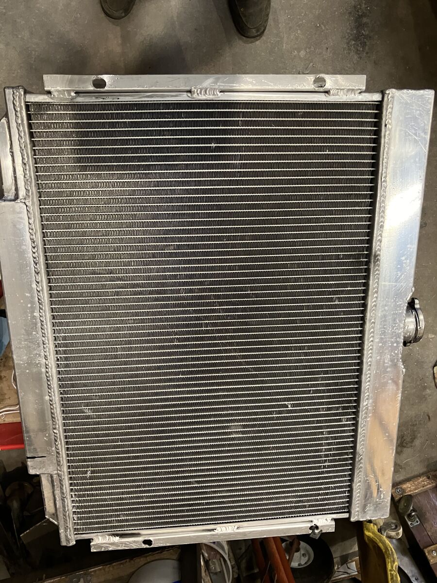 USED ALUM RADIATOR AND DUAL ELECTRIC FAN set up Radiator Core approx 16-1/2 tall x 24 wide 3 cores 1-1/2 inlet (pass side lower 1-3/4 outlet (driver side) comes with 2 - 12 inch electric fans and shroud included, has bypass flaps in shroud