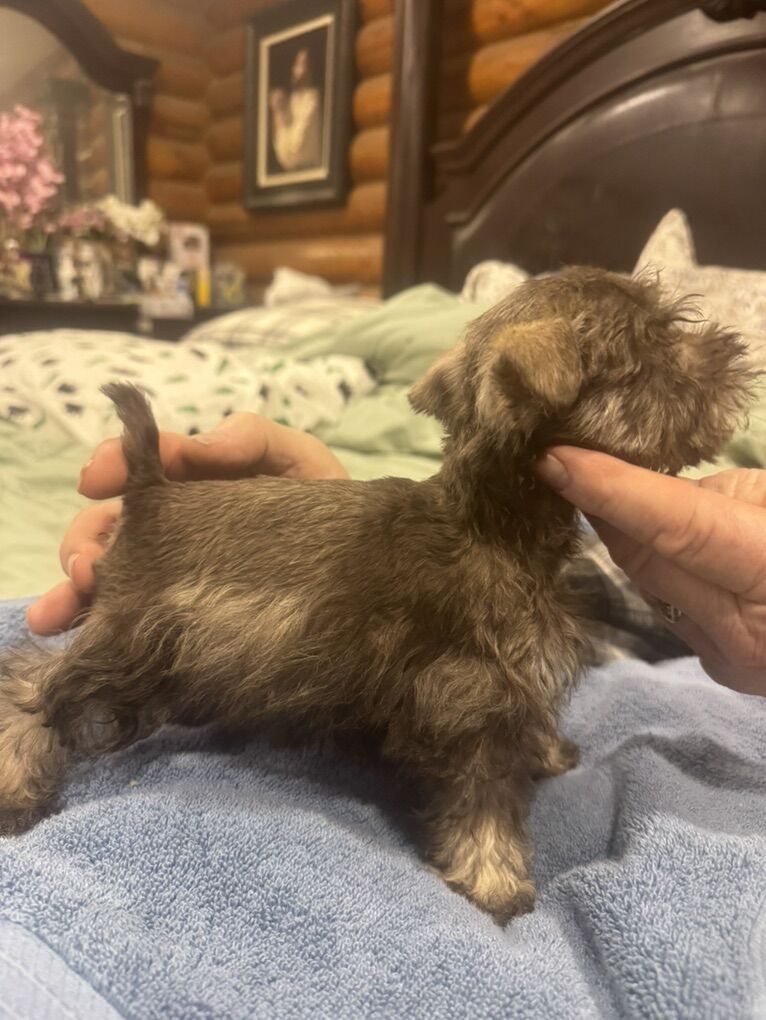 ZelleBeautiful AKC miniature Schnauzer puppies very small tea cup size. They come with full registration papers. Tails docked Dew claws removed. First shots and wormed. These baby’s have been well socialized and loved. They are playful and fun. They are 10 weeks old ready to go to their forever homes. We have 1- super tiny female-salt and pepper $1500.00 2-chocolate females $1250.00