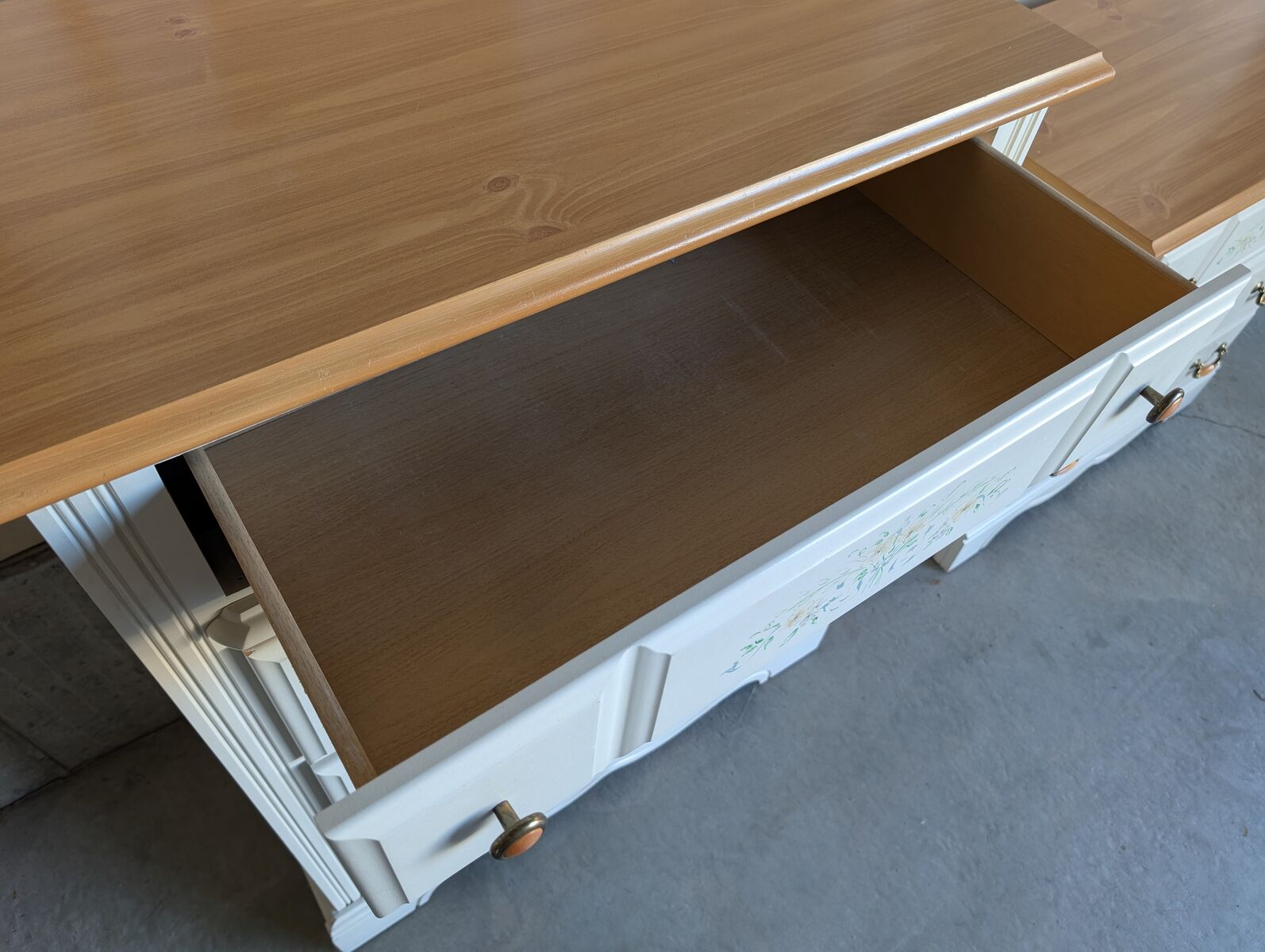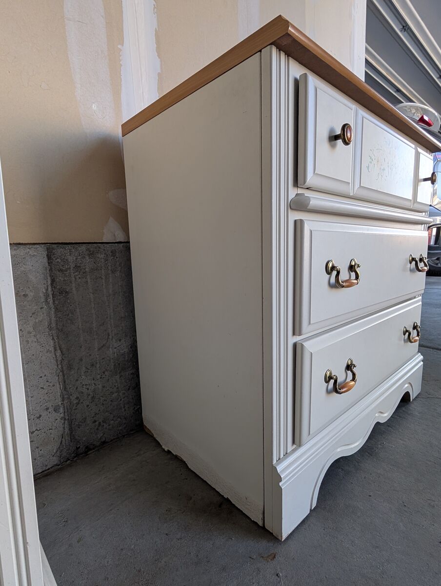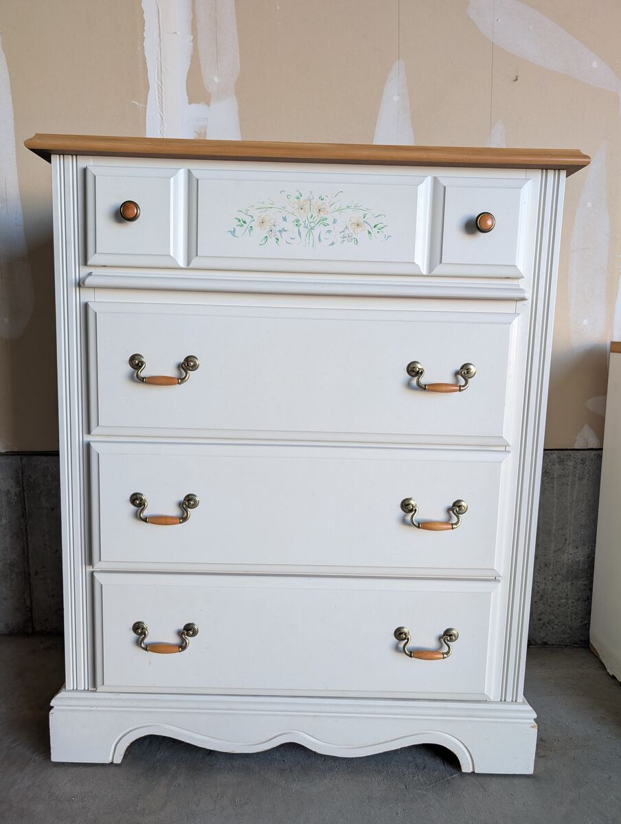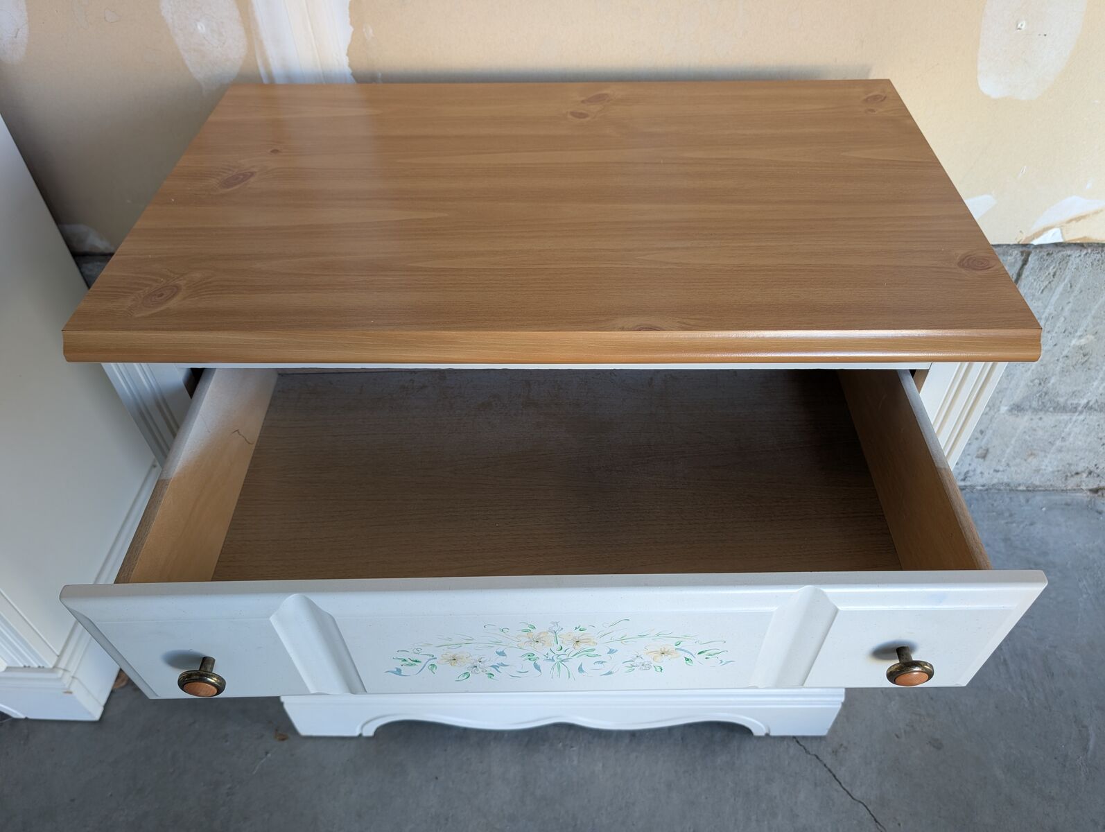 VenmoVery cute high quality girls bedroom set in great condition! Sold as set. All drawers are clean (no marker/paint/gum, etc.) and work perfectly. Really solid and great quality. Only flaw is with the nightstand—there is water damage along the base (shown in picture). Otherwise, great bedroom set! Includes: Dresser (4 drawers) - 34"W x 42"H x 18"D Nightstand (3 drawers) - 30"W x 42"H x 18"D Headboard Bed frame (for twin bed)