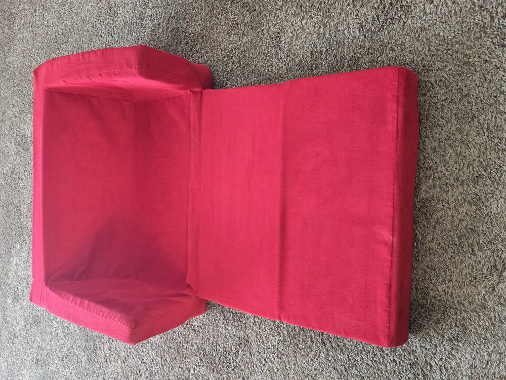 VenmoAdorable soft red children's sofa that pulls out to a sleeping pad. In great condition, has removable shell cover that can be washed. Dimensions are 12" tall x 27" wide x 16" deep. Unfolded it's 32" long. Asking $20 cash or venmo only.