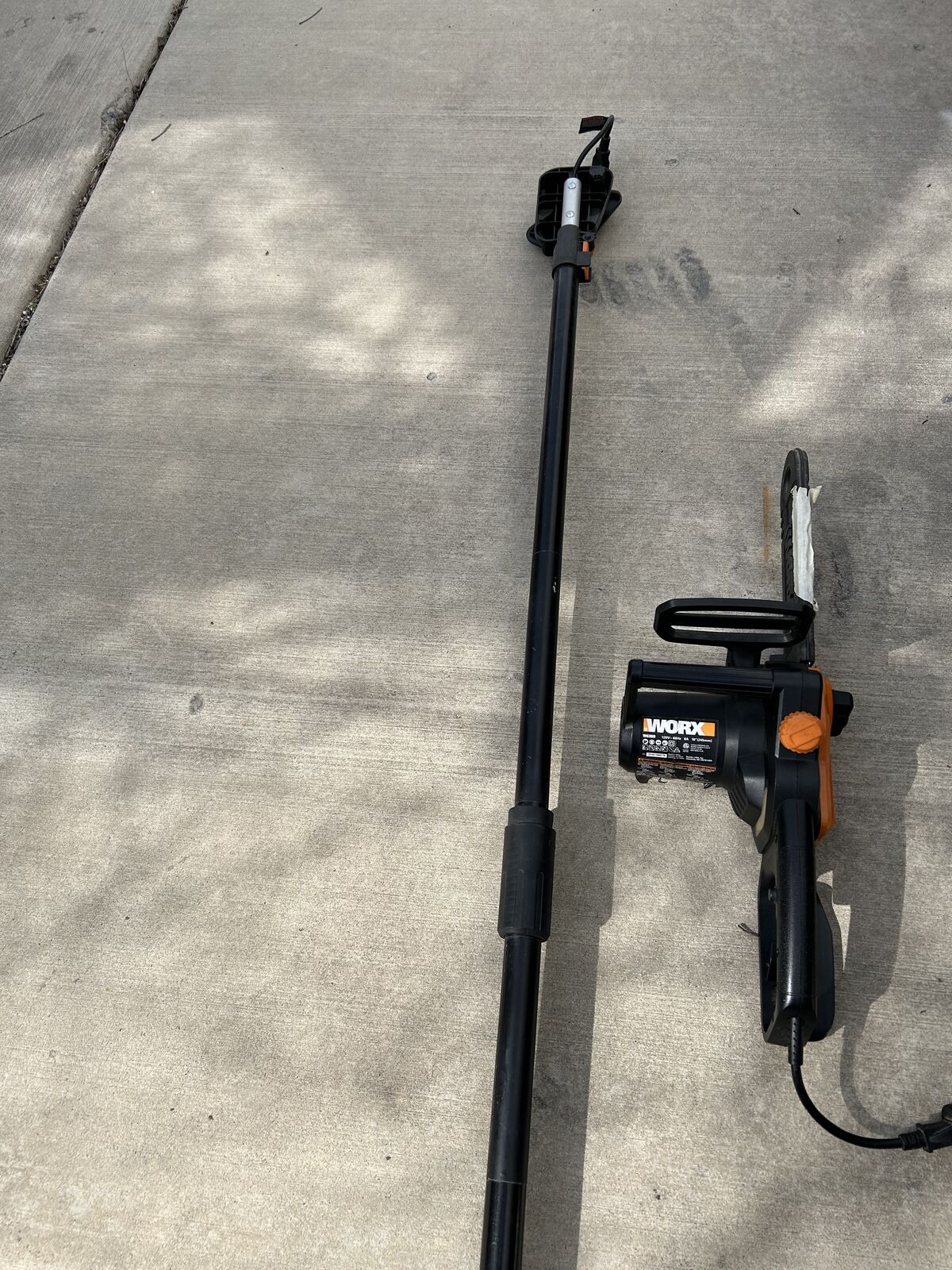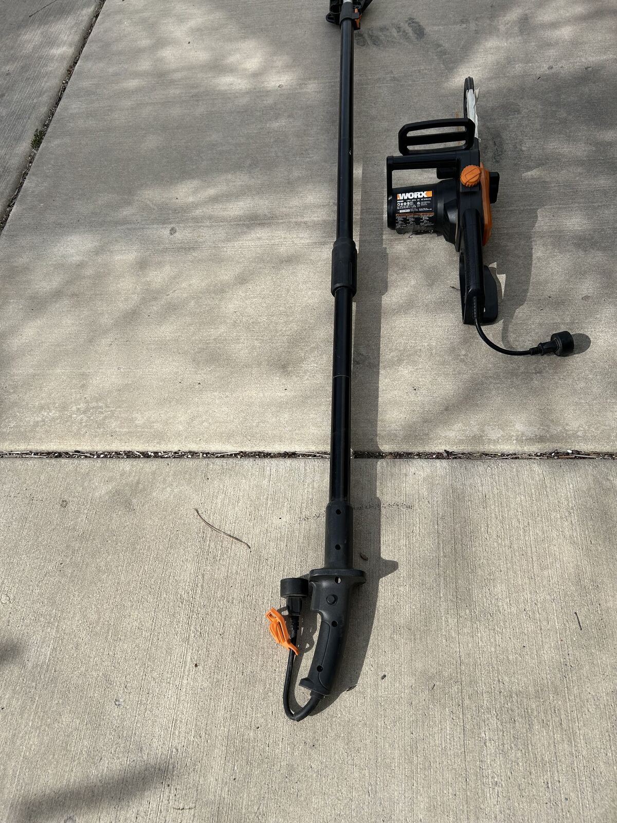 Pick up this handy, versatile extended WORX chain saw. Reaches limbs easily. Stay off the ladder. Used very little. Ready to trim. Electrical.