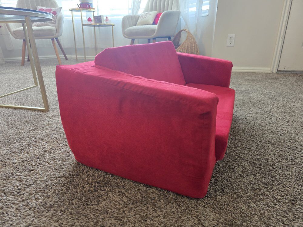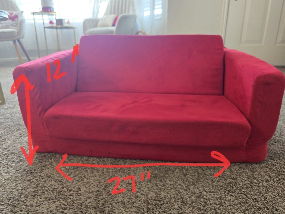 VenmoAdorable soft red children's sofa that pulls out to a sleeping pad. In great condition, has removable shell cover that can be washed. Dimensions are 12" tall x 27" wide x 16" deep. Unfolded it's 32" long. Asking $20 cash or venmo only.