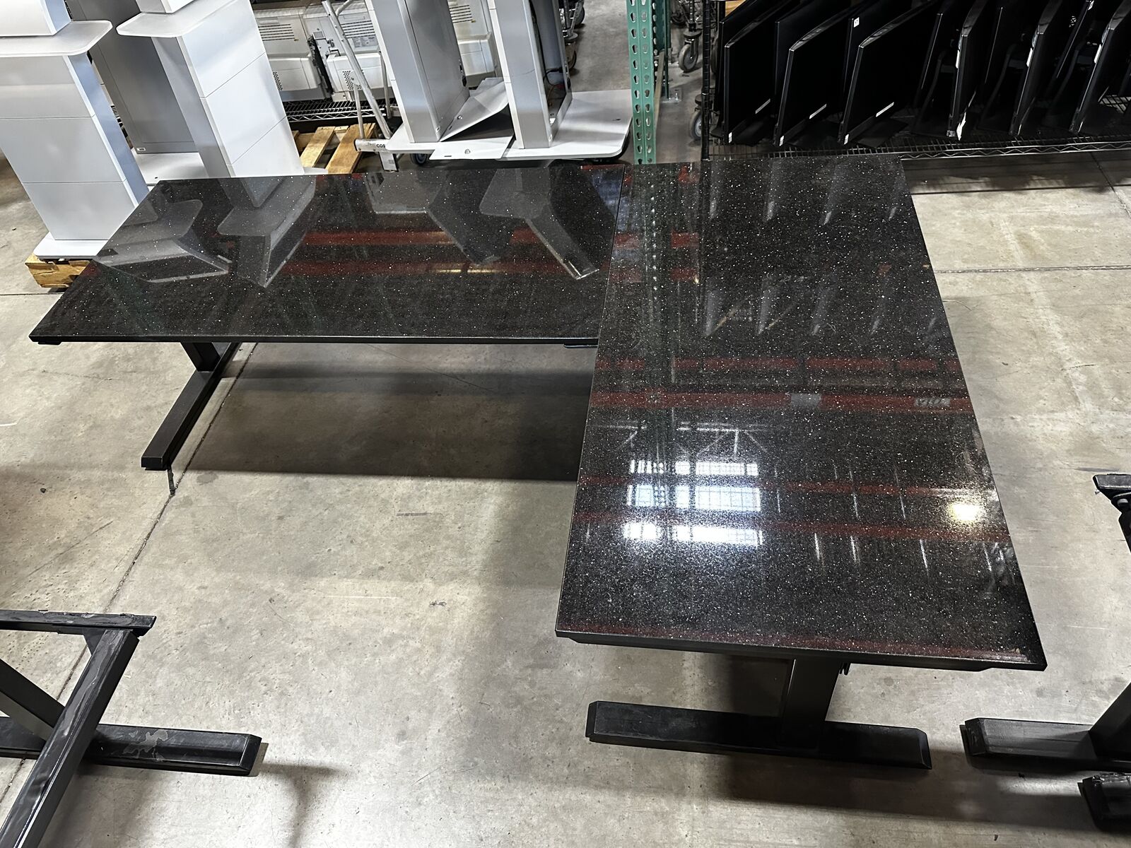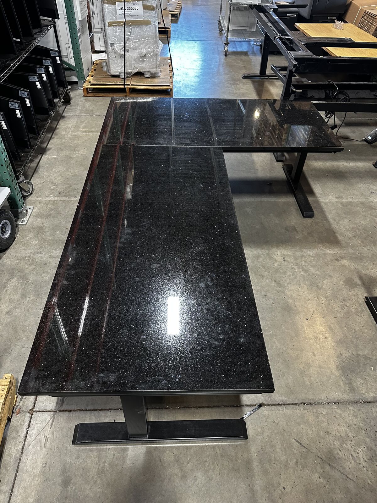 ApplePayUpgrade your workspace with this sleek L-shaped desk, designed for serious productivity. The black granite top pairs with a sturdy, adjustable black metal frame for a professional look and ultimate durability. Perfect for multiple monitors, laptops, notebooks, and all your work essentials. Long side: 90” Short side: 60” Depth: 30” Adjustable height: Sit or stand with ease Strong, stable metal frame Clean black finish (Not scratched, getting mirror effect in pictures) Modern granite surface Work smart. Work in style.