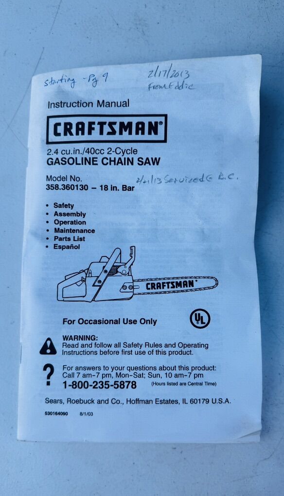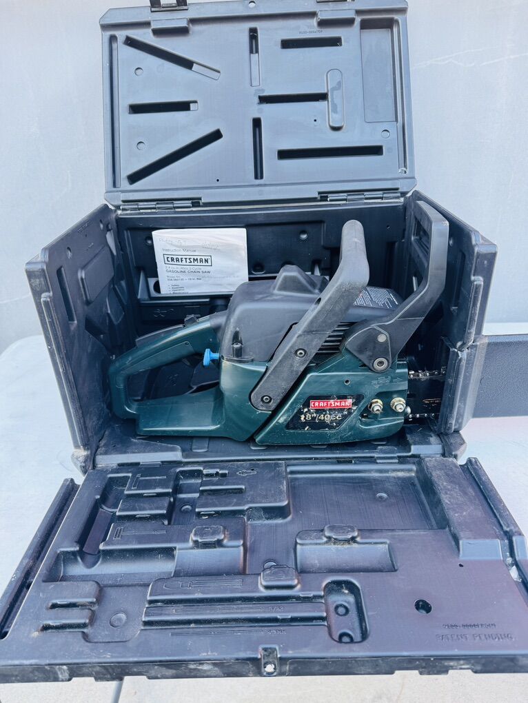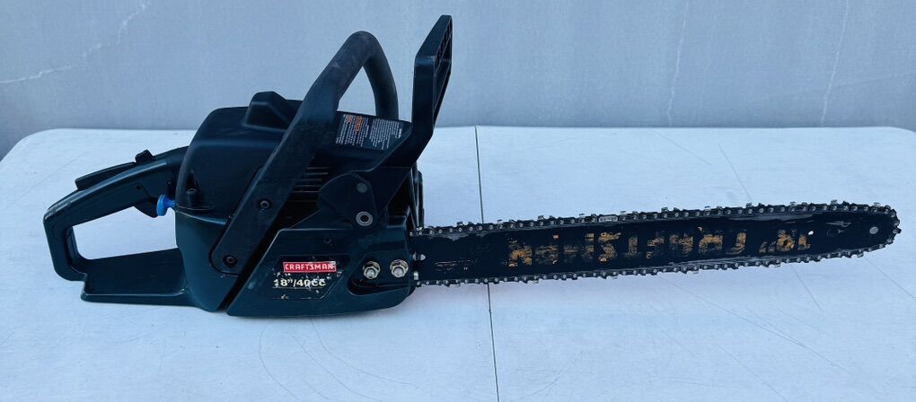 General Description The Craftsman 18”is a gas-powered chainsaw designed for general outdoor cutting and wood-cutting tasks. It features a 2-cycle gasoline engine with a displacement of approximately 2.4 cu. in. (40 cc), and is built with an 18-inch guide bar and chain, giving it good reach for cutting firewood, trimming trees, and general yard work.