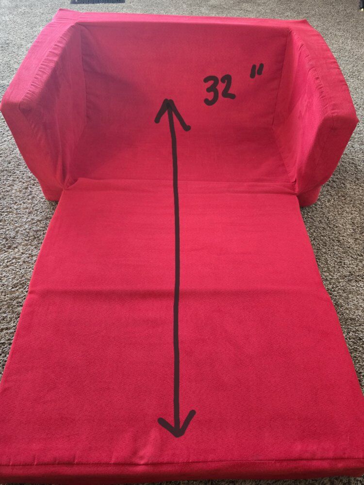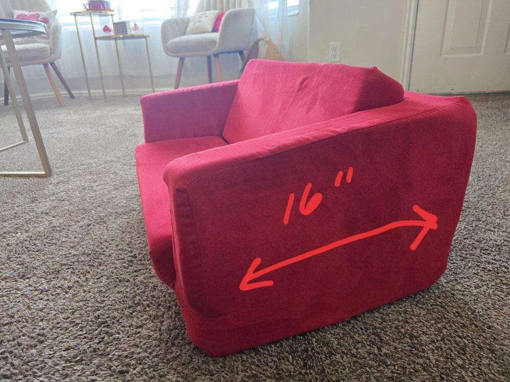 VenmoAdorable soft red children's sofa that pulls out to a sleeping pad. In great condition, has removable shell cover that can be washed. Dimensions are 12" tall x 27" wide x 16" deep. Unfolded it's 32" long. Asking $20 cash or venmo only.