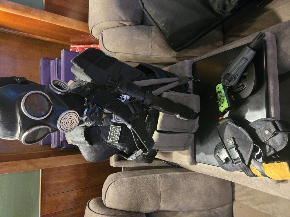 VenmoKrytac AR w/ adjustable butt stock -Rail laser -UV Activated Moc Suppressor for BB Trailing -added iron sights. Elite Force custom 1911 with real (zombie Green)Grips -muzzle break -BlackHawk 1911 holster that locks upon insert. easy finger release. Elite force custom Revolver with deer skin grip. -leg holster for sidearm Tac Vest with shoulder pad. \