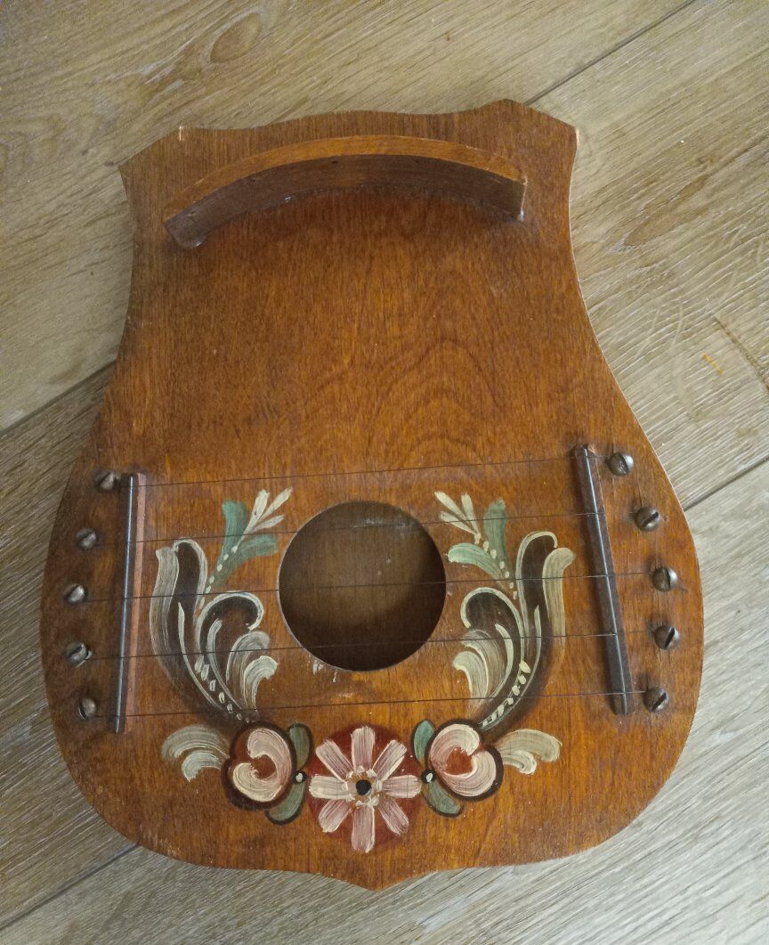 Vintage hand painted design wood door 5 string harp wall hanger. 12"lg x 10" at widest width. A beautiful piece with great sound.