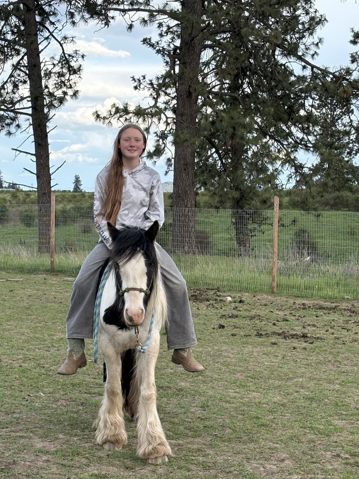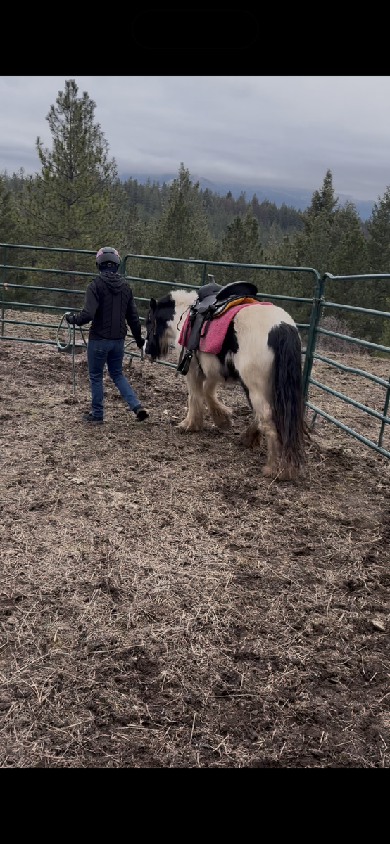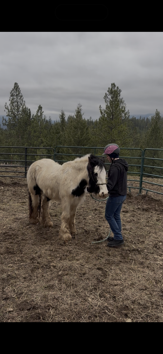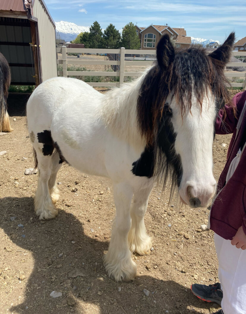 I am selling this beautiful registered Gypsy Vanner 3 year and 8 month old Mare. She was born on May 17,2022 and she is a pie bald, back and white mare. Breakfast at Tiffany's, barn name "Tater" is a wonderful project horse, and possibly a prospect kids pony. She doesn't mind being saddled, and is not cinchy in any way. Does fine with weight on her back as well. I have taught her loads of ground work, hip flex, shoulder flex, backup with little pressure, and she is completely halter broke. I have introduced her to a simple bit and she is adjusting well. She has a eagerness to learn new things as well. don't mind bags, or crinkly things and I am currently still working with her. She is a sweetheart and will follow you anywhere. I have not yet rode her saddled, but I have done little rides around her pasture bare back and she was wonderful, she did not buck, bite, or rear. if you have any questions or are interested feel free to reach out to 385-626-1522, Madilyn. I will be happy to send more photos and videos upon request. I am asking 10 grand, or best offer.