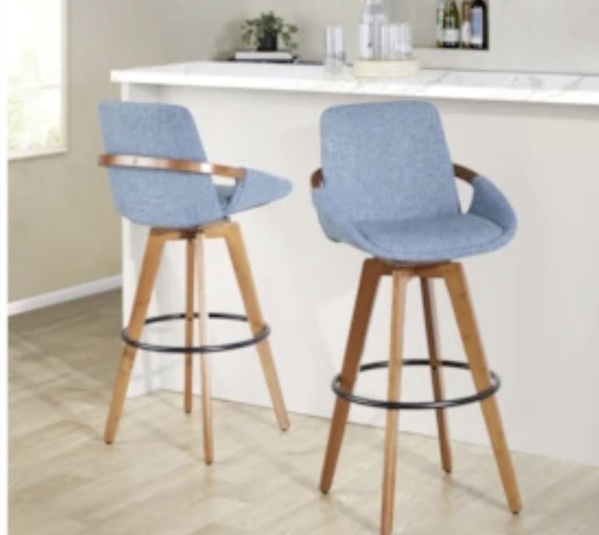 VenmoMid-century modern swivel bar height stools. Brand new from Living Spaces. High quality walnut bamboo and beautiful upholstery. See specs and reviews on Living Spaces website- “Chilton Blue Noise Fabric Upholstered 29 Barstool In Walnut Bamboo With Round Black Footrest.” $100 each or $350 for all four. Cash or Venmo.