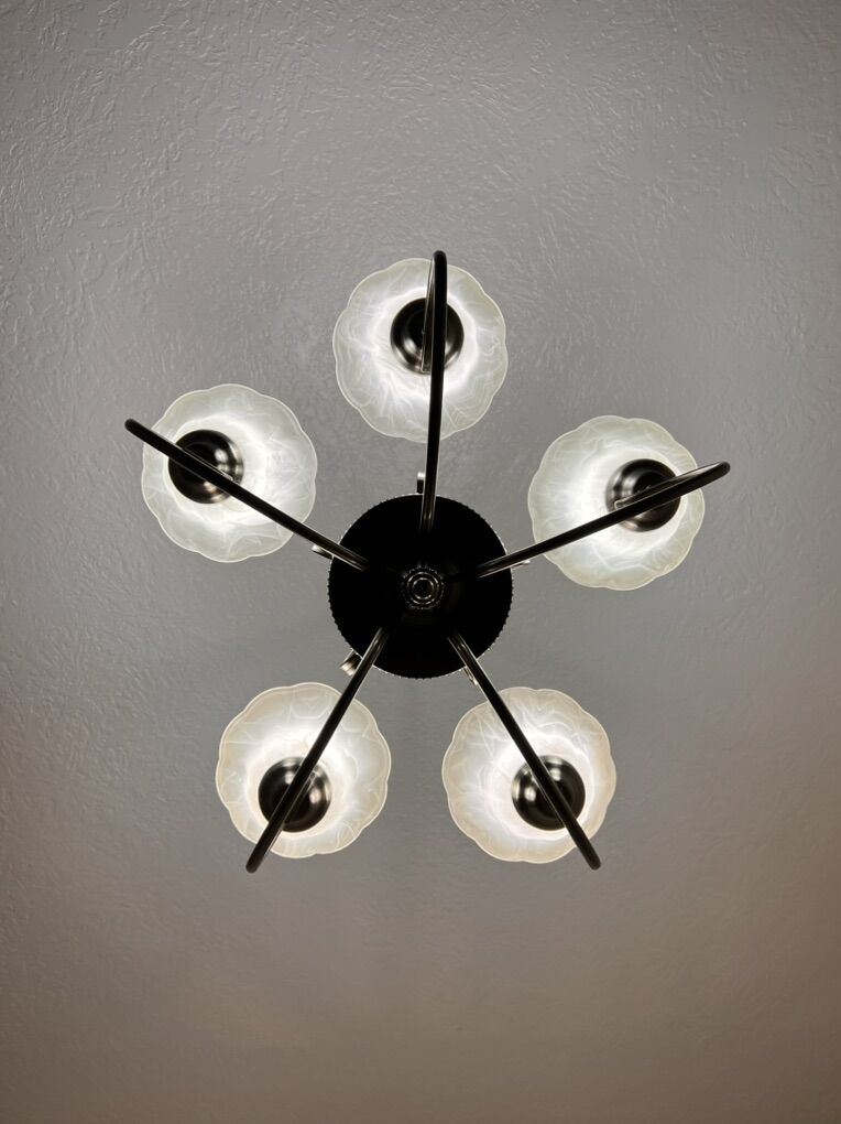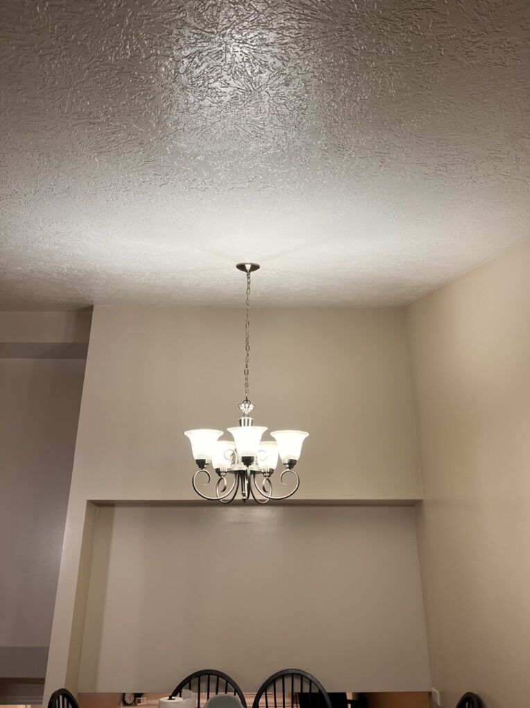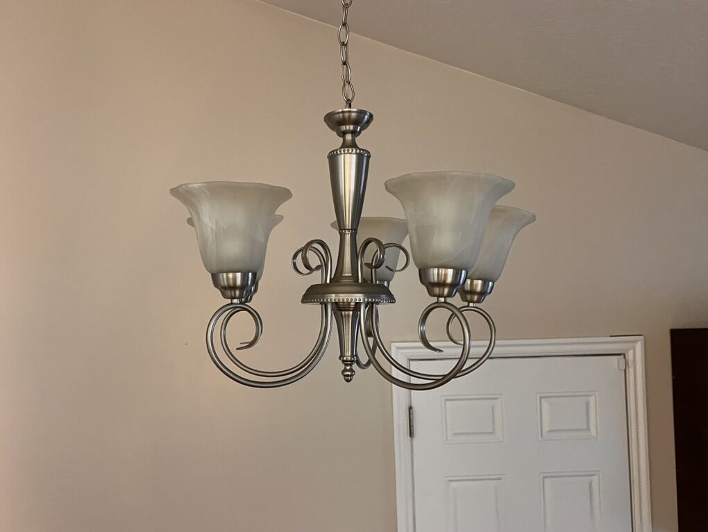 ZelleBeautiful 5-light chandelier in brushed nickel with frosted glass shades. Classic, timeless design that works great in a dining room, kitchen, entryway, or breakfast nook.\