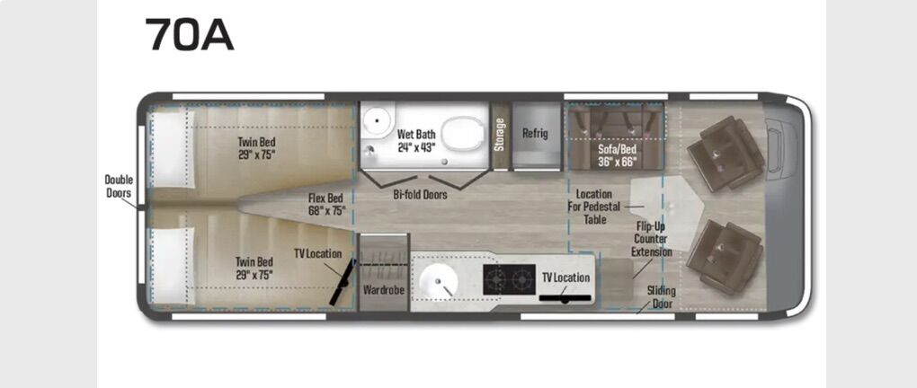 Head out to the desert, your favorite state park, or the ocean in this comfortable motorhome! The rear double doors allow you to let fresh air in once you park, and you can take a rest on the twin beds or convert them into a 68 × 75 Flex Bed to share with your spouse. After a hike in the woods, freshen up in the convenient wet bath that features bifold doors for more space. You can easily store all your belongings in the large wardrobe, and the 24 HDTV with a remote will make movie night hassle-free! Preparing meals will be a snap on the two burner range, plus there is a microwave oven for on-the-go meals. This model includes a flip-up counter extension for more prepping space, plus a removable pedestal table so you can enjoy coffee while sitting in the swivel captain's seats. And don't forget about the 4x4 option to go off the beaten path if you choose!