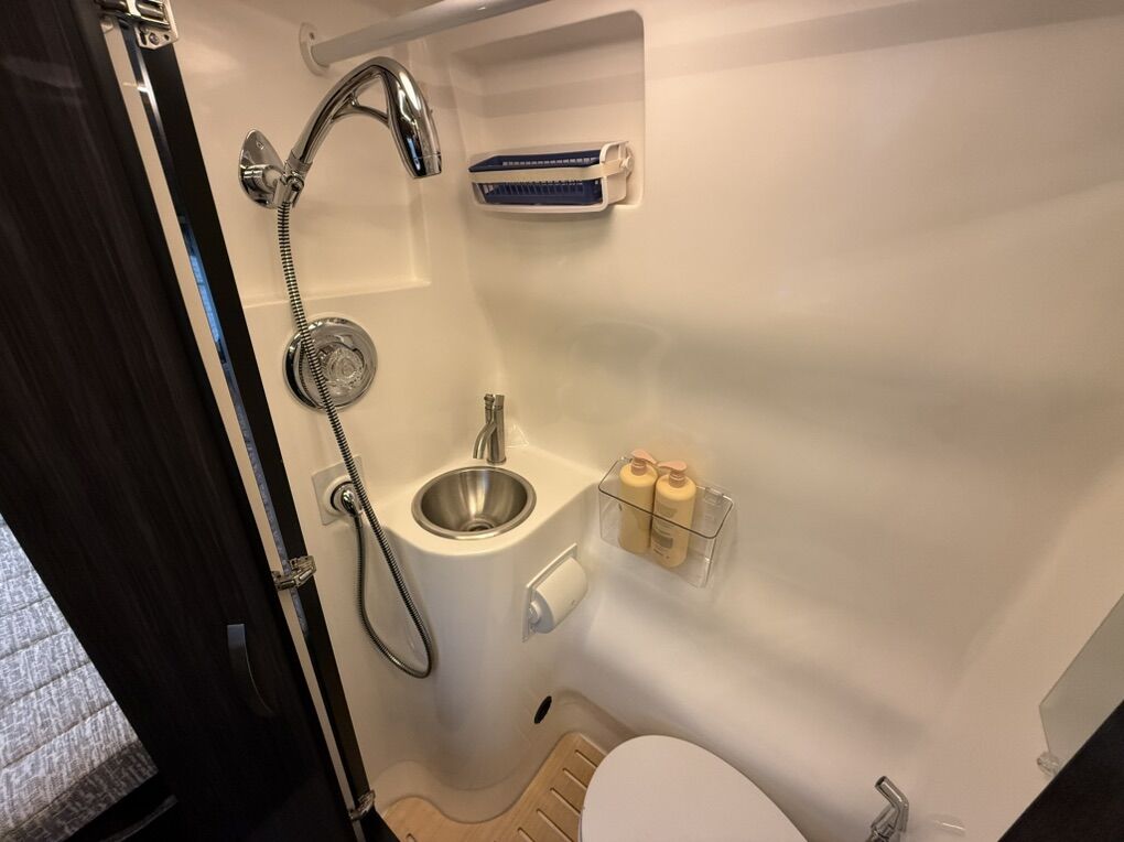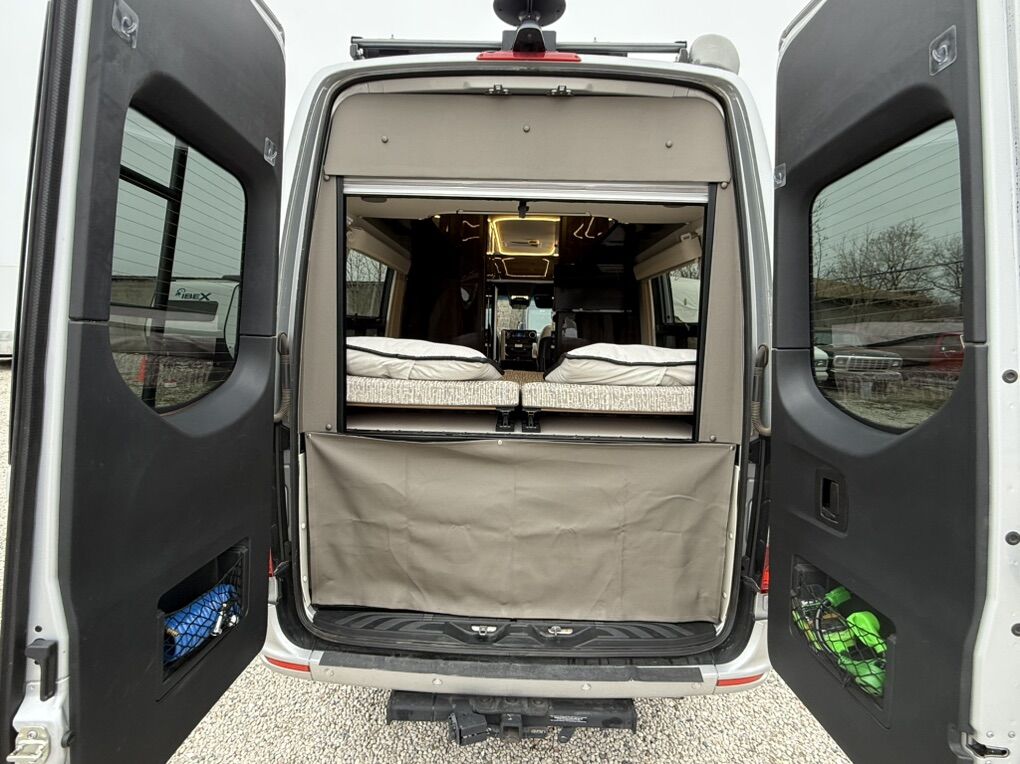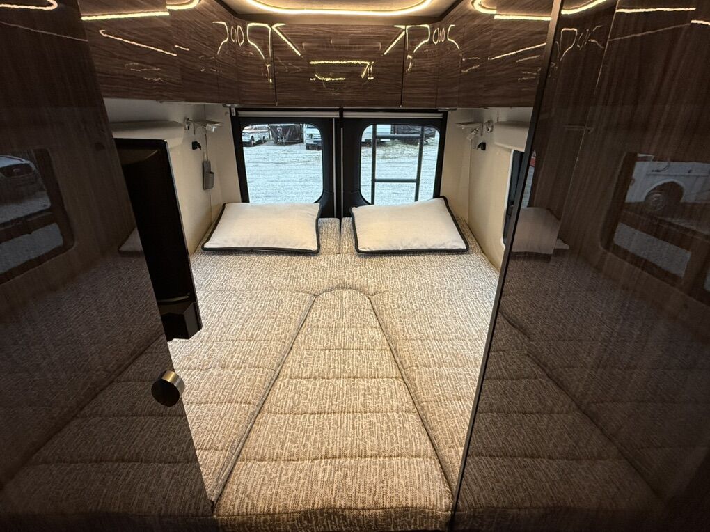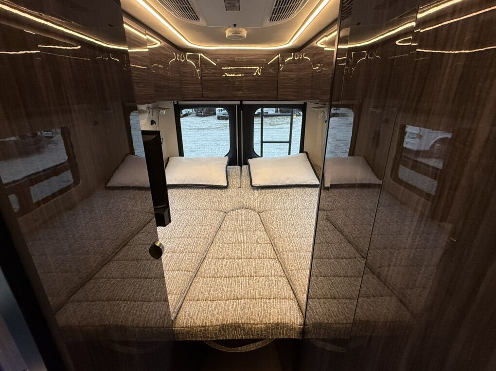 Interior Features • Sleeping: Twin beds with Flex Bed System (convert to queen/dinette) • Kitchen: 2-burner range top, 5.5 cu. ft. 12V fridge/freezer, microwave, sink • Bath: Wet bath (24x43) with flexible showerhead, toilet, sink, powered roof vent • Comfort: 13,500 BTU A/C, Truma Combi heating, swiveling cab seats, pedestal table