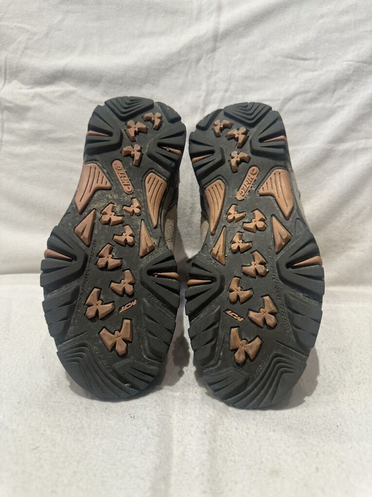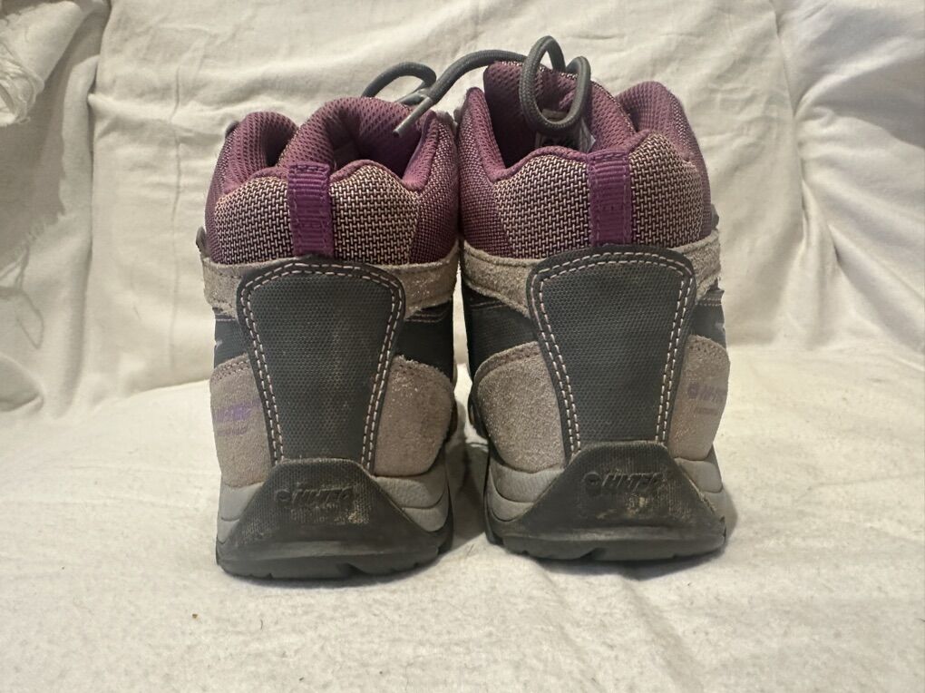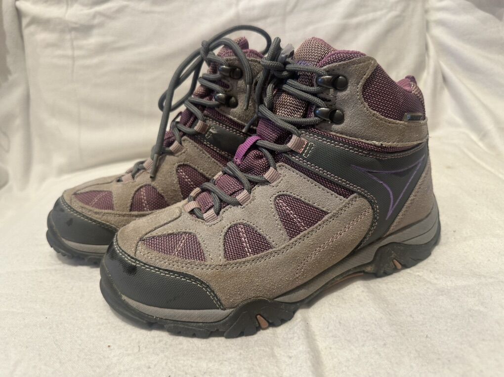 Hi-Tec youth size 3 gray/purple leather and textile waterproof mid hiking boots. These are in good condition, the only issue is there is a little bit of the paint rubbed off on the front of the toe area. See photos for details. I take cash or Venmo, but cash is preferred. Text is best. 801-201-4446. Check out my other ads for additional sizes and styles.