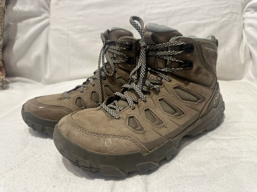 Oboz women’s size 7 brown/beige leather and textile waterproof mid hiking boots. These are in good condition, see photos for details. I take cash or Venmo, but cash is preferred. Text is best. 801-201-4446. Check out my other ads for additional sizes and styles.