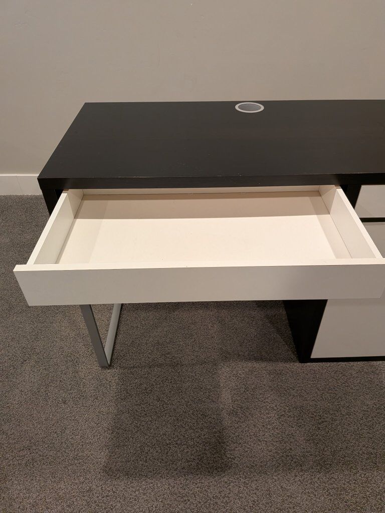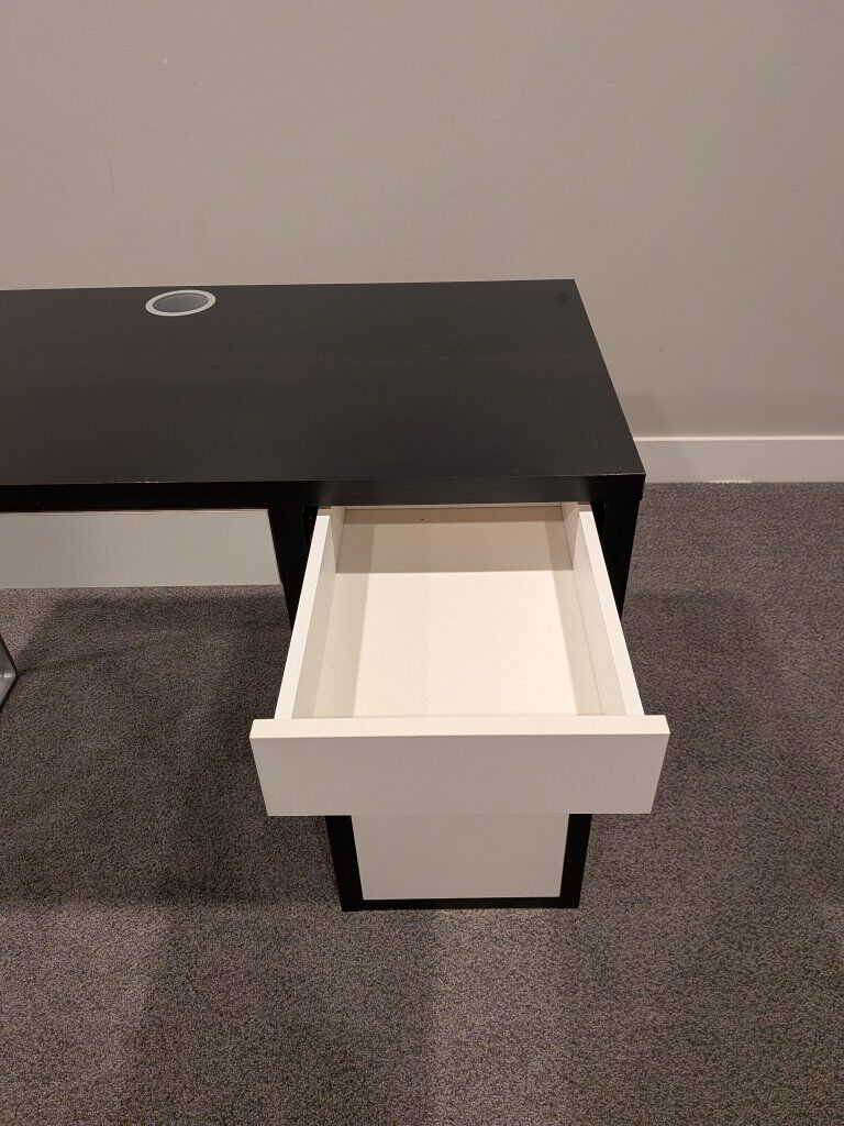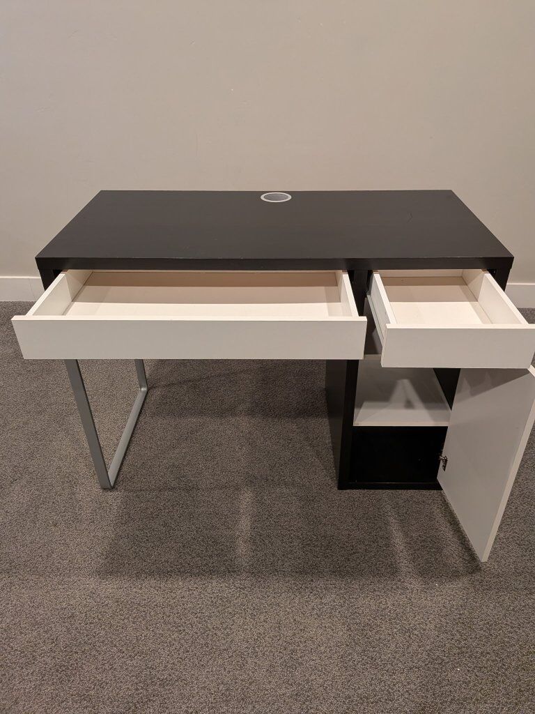 VenmoBlack and white student desk in good condition. 2 working sliding drawers. Cabinet with 2 shelves. Opening for cords to go through. Scratch on desktop (see picture). 41.5"L x 20"W x 29.5"H
