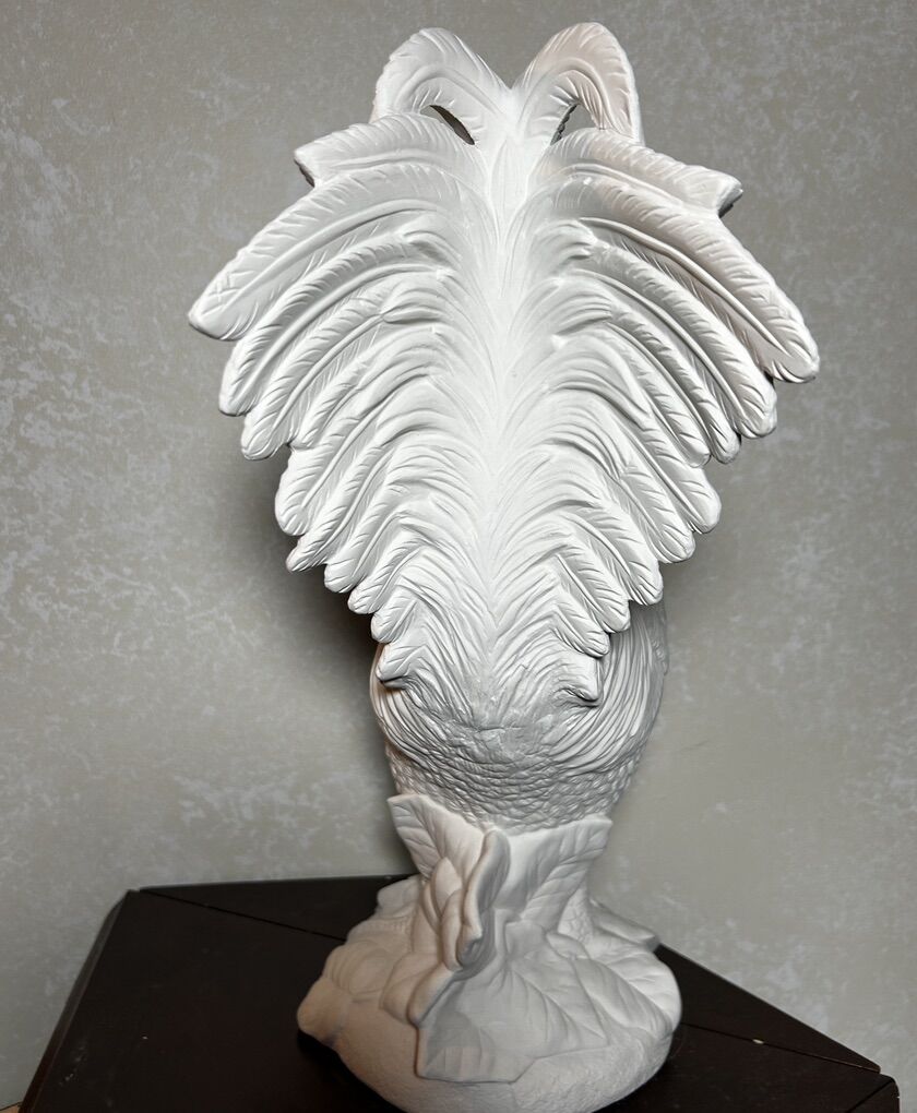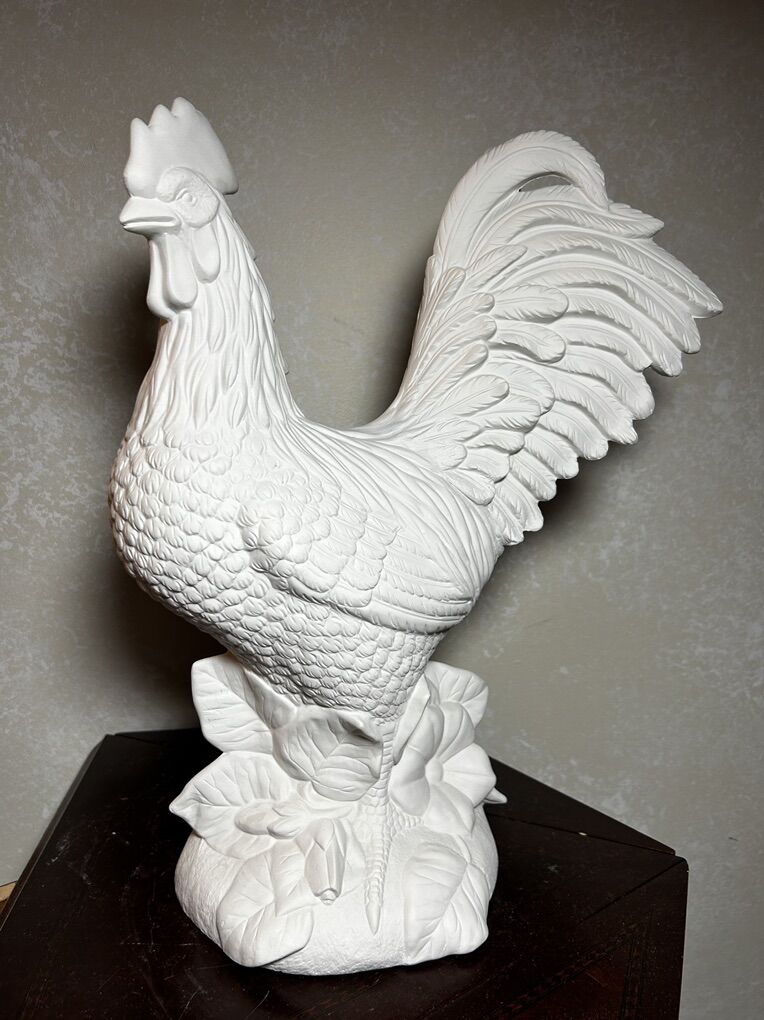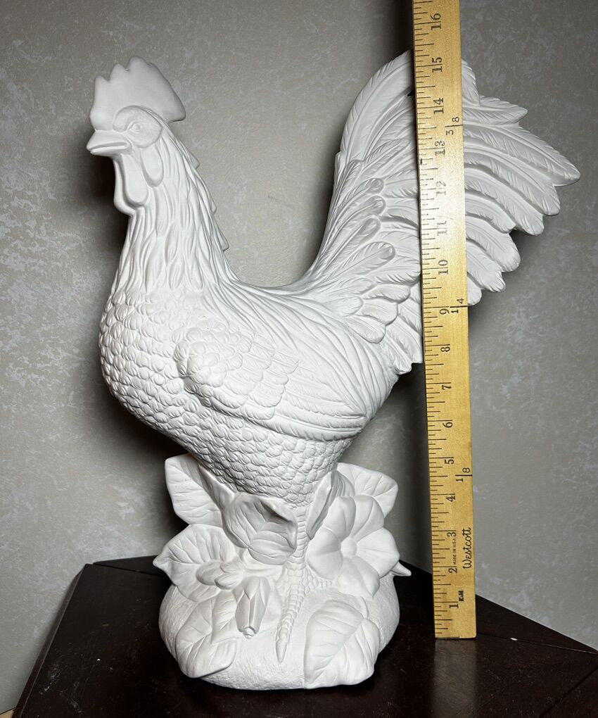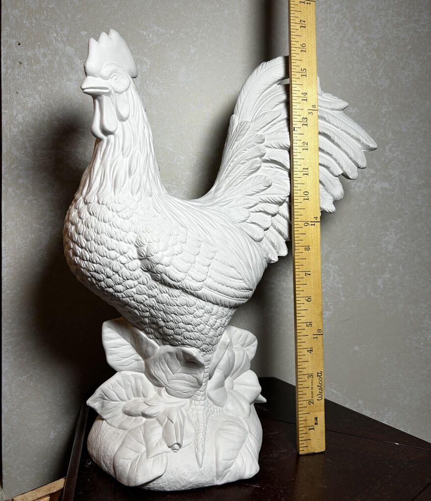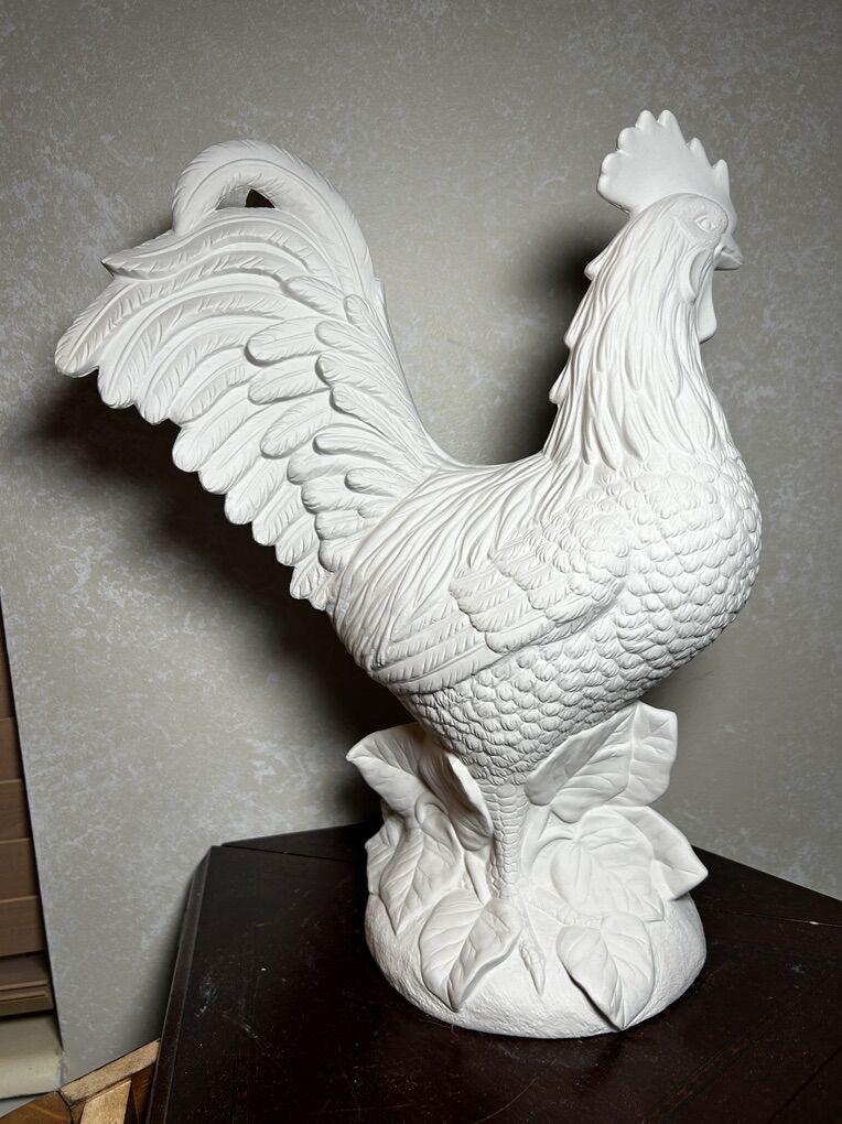 Large bisque detailed Rooster Chicken made from a mold of ceramic clay. The bisque is ready to paint- either all one color, like white since it looks so good as it is, or with a lot of color. Large Rooster is 16” tall with no chips, cracks, scratches, or defects except for one leaf on the base that is a little strange. Delivery to a convenient location when in your area for $5.