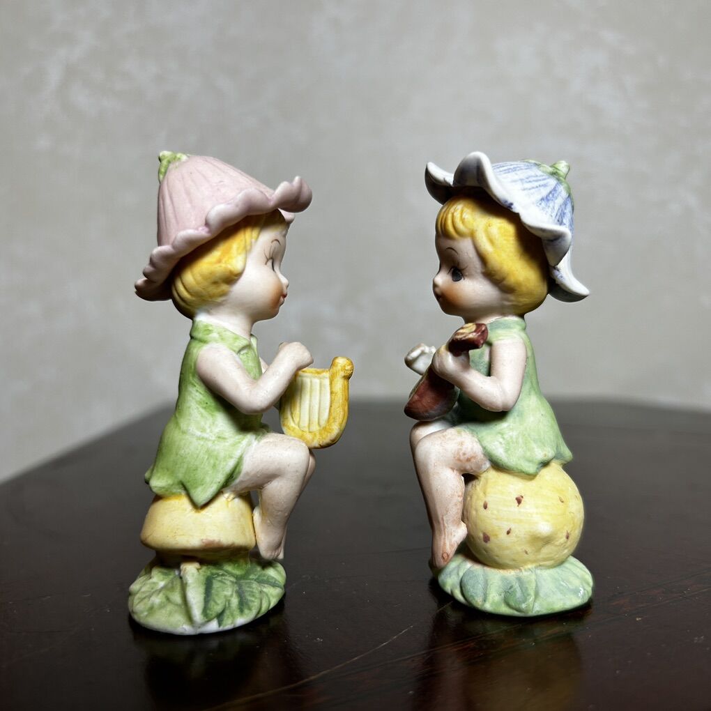 Two VERY RARE Matching Sweet Little Pixie - Elf - Fairy Figurines with the cutest smiles. One is sitting on a mushroom, the other sitting on an acorn. Both have matching green dresses and wearing different blossom hats. One is playing a small harp , the other a traditional European mandolin. 3 inches tall; One has a “Made in Japan” sticker. No chips, cracks, crazing or defects. Delivery available to a convenient location when in your area for $5.