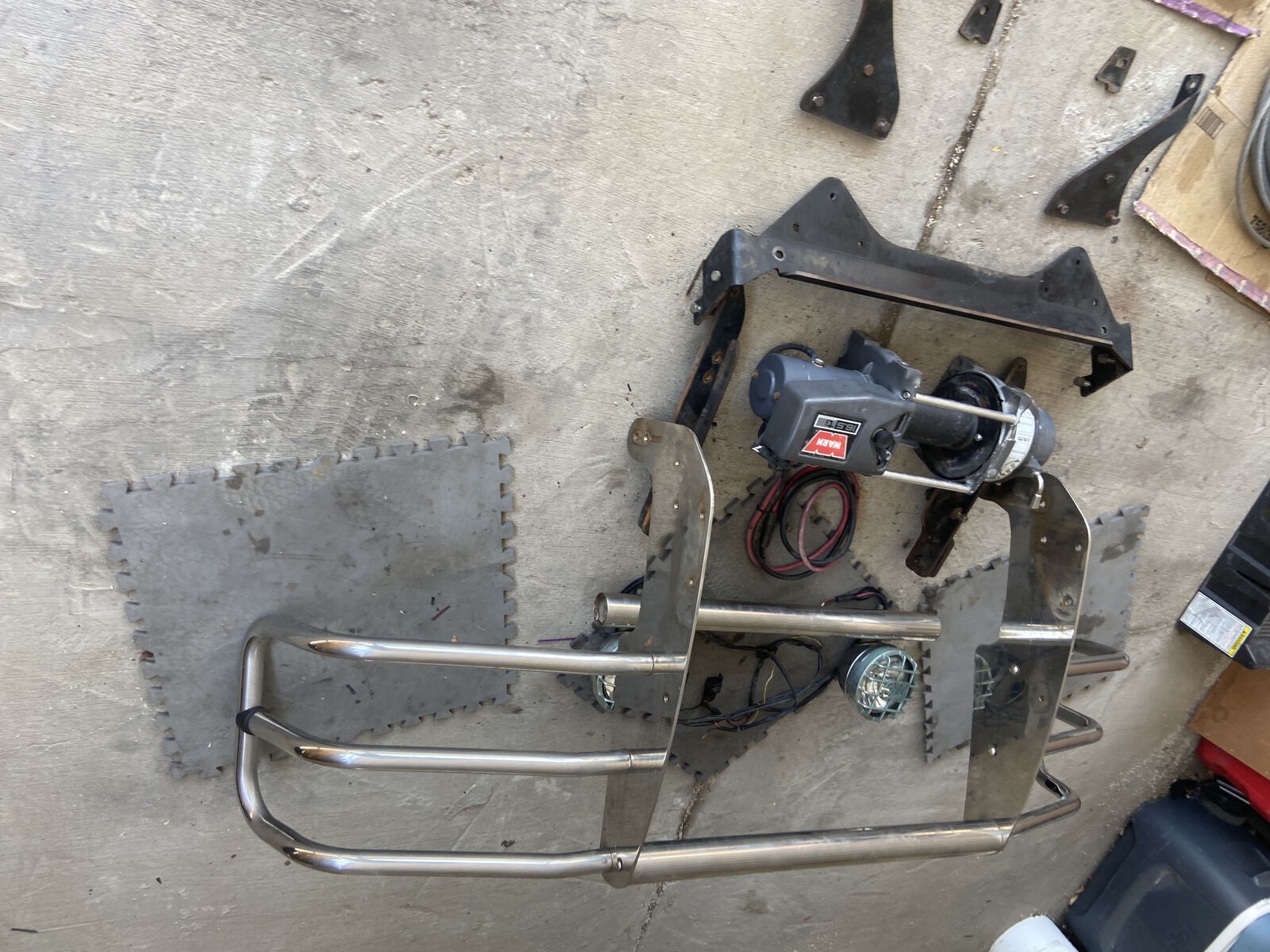 16,500lb Warn winch. Good used condition. Mounted on truck for 6-8yrs, but never used. Includes winch, 90ft steel 7/16” cable, 6ft remote controller, roller fairlead. (Chrome Warn Trans4mer Grille Guard sold separately). Weighs 135lbs, 24”L X 9”H X 9”W. Text is best.