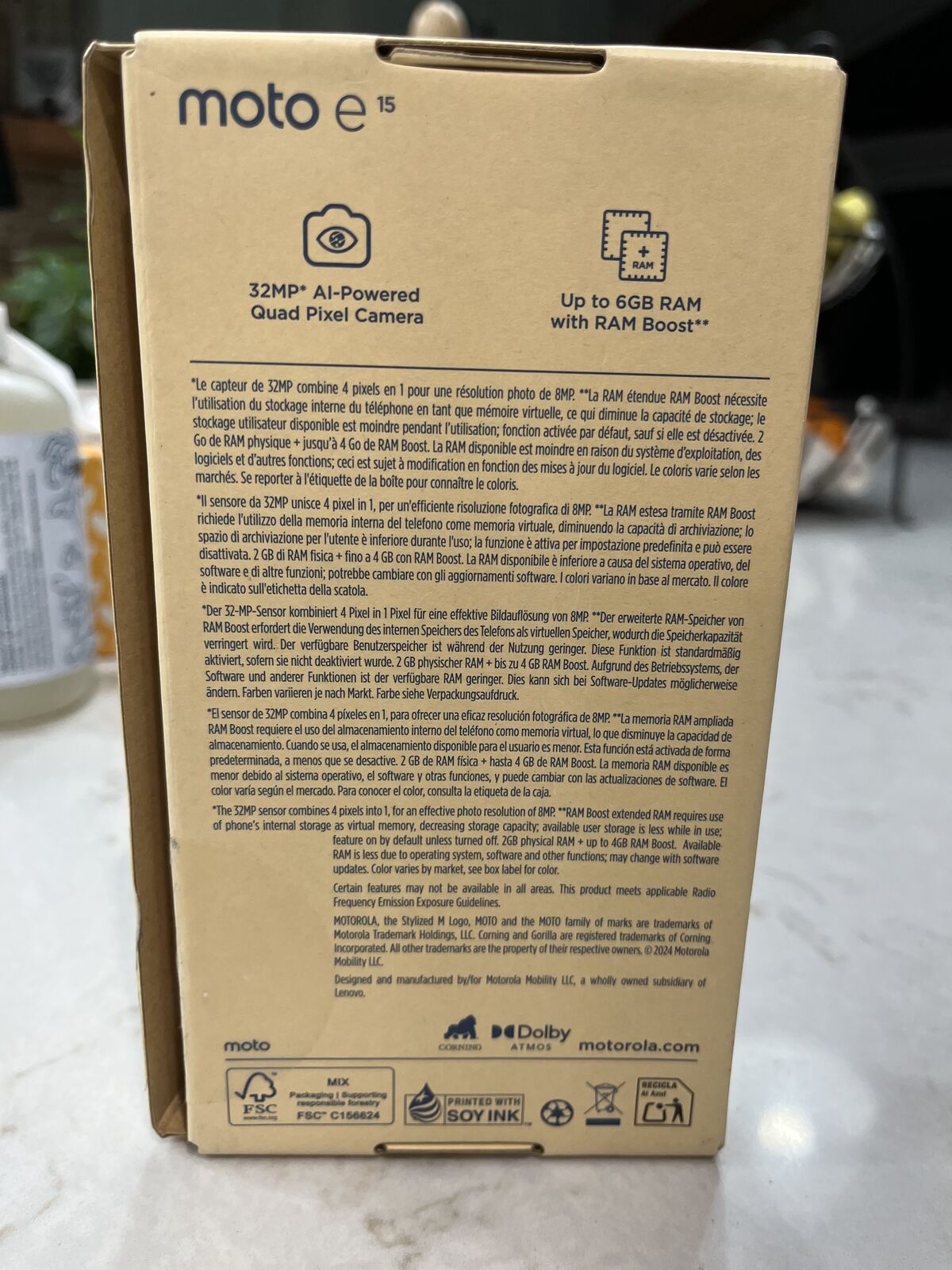 VenmoNew Moto e 15 phone and case. I bought this two weeks ago in Milan Italy on a trip because I was told I needed an Italian phone to complete a transaction there. I did not need it so I'm selling it. I have never used anything but an iphone, so I don't know anything about it. I erased it and rebooted it. Bought for 119 Euro, Asking $59 OBO