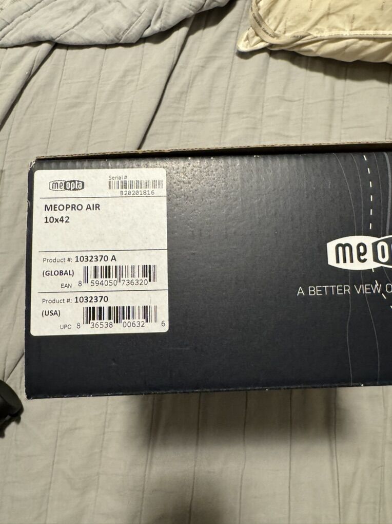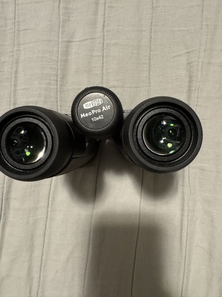 For sale is a like new pair of Meopta Meopro Air 10x42 binoculars. They were used for one Archery deer hunt. 7 days total. They will be in original packing and have been unregistered so they still have full warranty and can be registered to you. Amazing glass and at this price even better. Let me know if you have any questions.