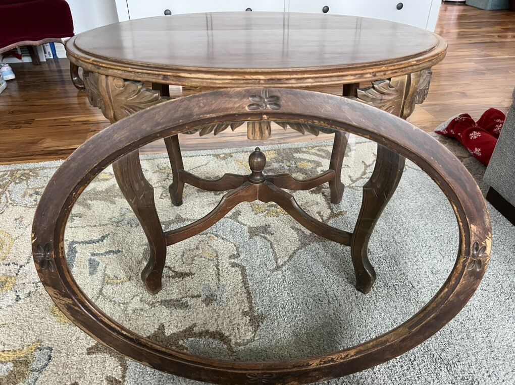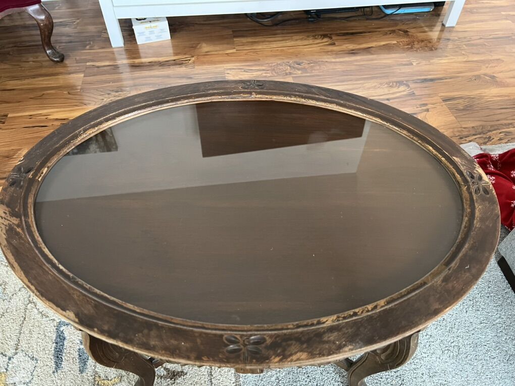 VenmoCharming vintage/antique oval side table (perfect as an end table, accent piece, or small coffee table) featuring intricate hand-carved wood with beautiful floral leaf motifs, flower details, and a classic central emblem. The removable beveled glass top sits neatly in the carved rim, making it easy to clean and versatile for displaying decor or using as a tray.