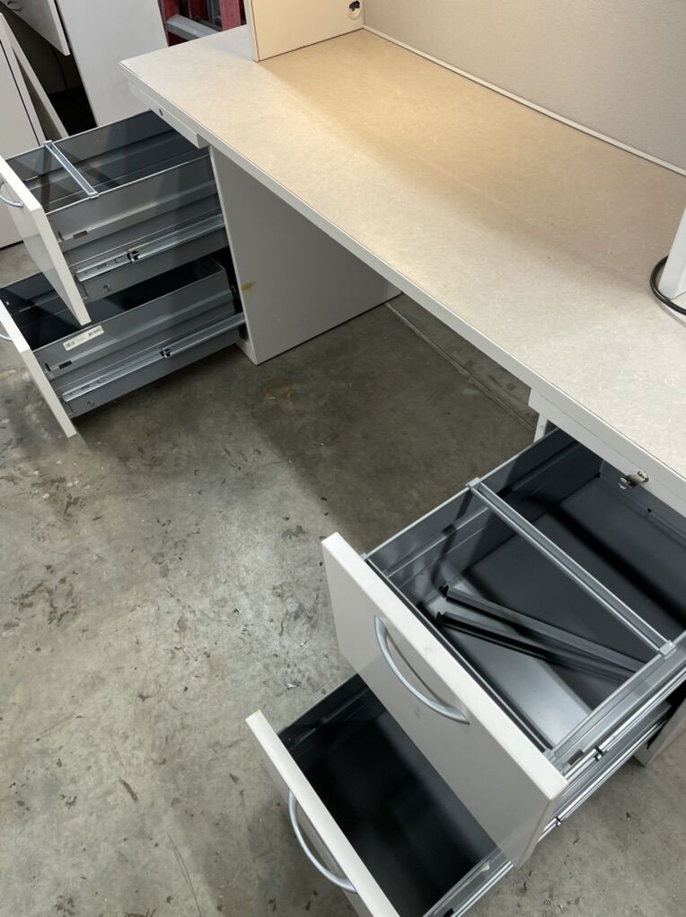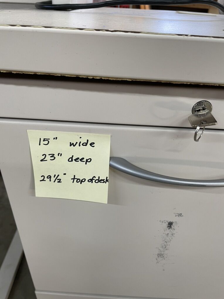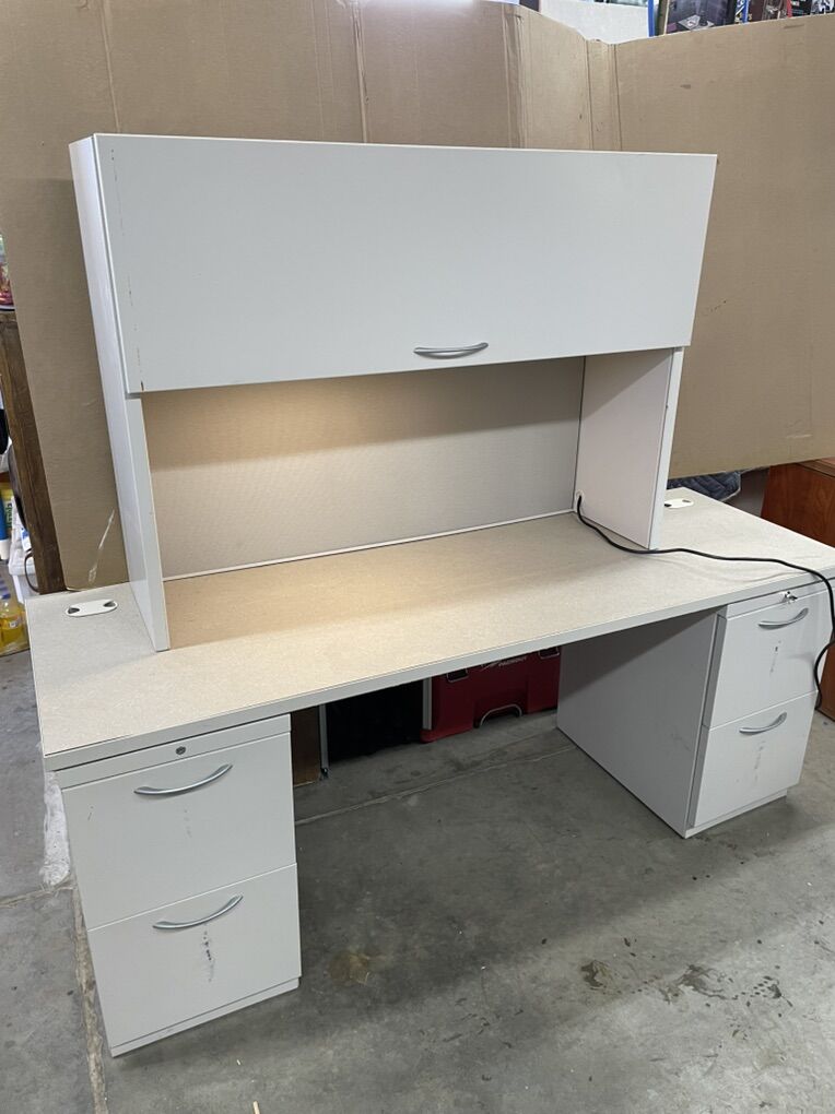 VenmoOnly 1 left. 6’ x 24” desk top (2)ea 2drawer file cabinets 48” wide x 14” deep hutch w/ roll top lid. Has a light under the shelf. The back panel is fabric covered pin board. (Thumb tacks) Color: light putty