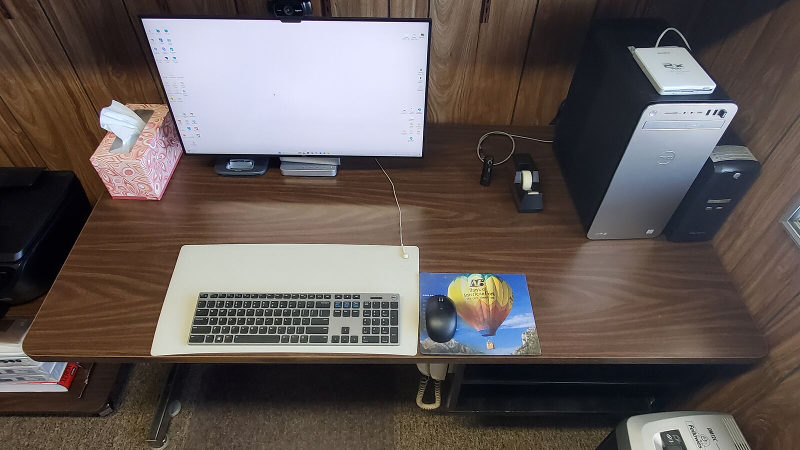 Virco heavy-duty simulated woodgrain computer desk. Strong metal legs with adjustable feet. Durable, easy-to-clean desktop with all-metal underside adjustable shelves for peripherals or other convenient storage. Cable routing access holes and cable clips in the rear and bottom. Convenient phone jack.