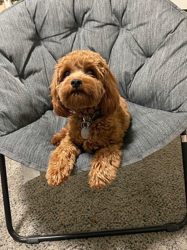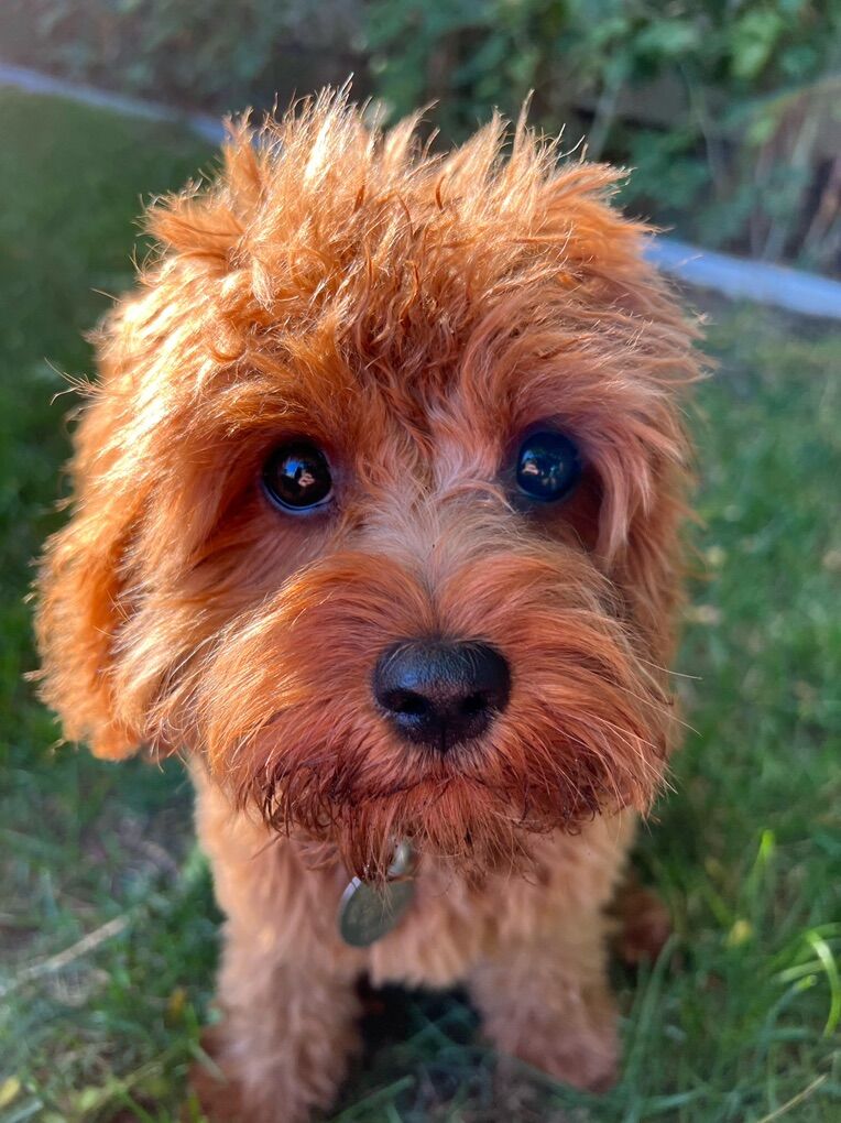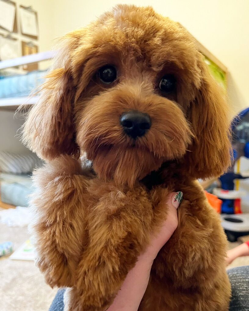 Fozzie’s mom was a 15-pound red Cavalier King Charles Spaniel, and his dad was a 5-pound red poodle. He is 9/10 intense red with silky-soft wavy fur. He has great tail and ears, a shorter cavalier-ish nose with big eyes, and a slim poodle-like body. People are usually surprised that he is fully grown— when groomed with a teddy bear cut, he very much still looks like a puppy.