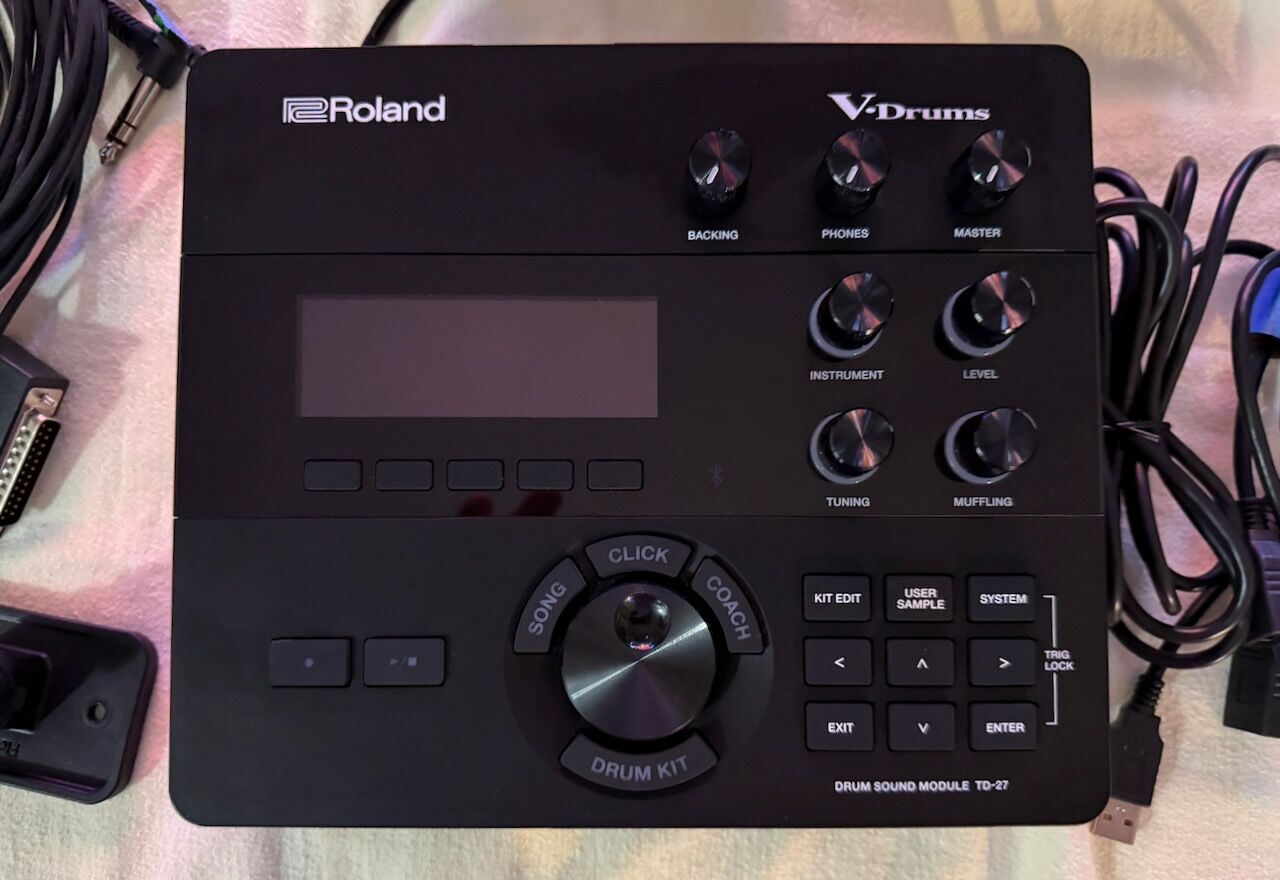 This TD-27 drum module is in near-perfect condition with no physical damage of any kind. Includes the power supply, harness, mounting plate and USB cables for the digital pads. I have also included the Roland USB cables.