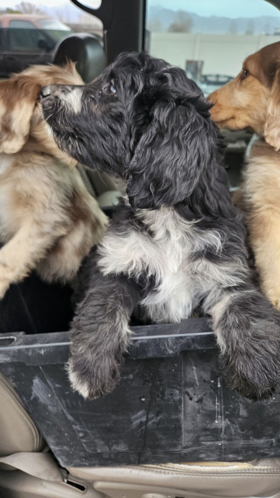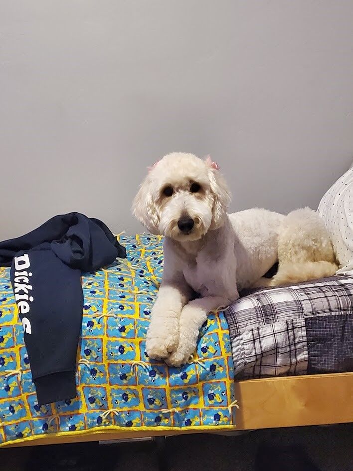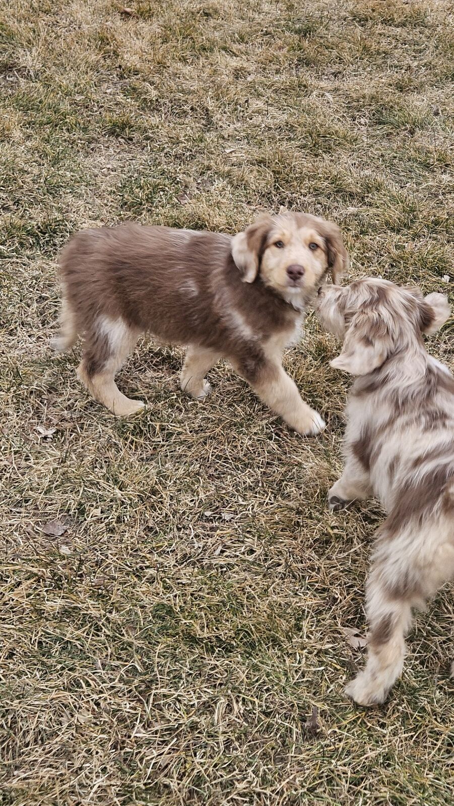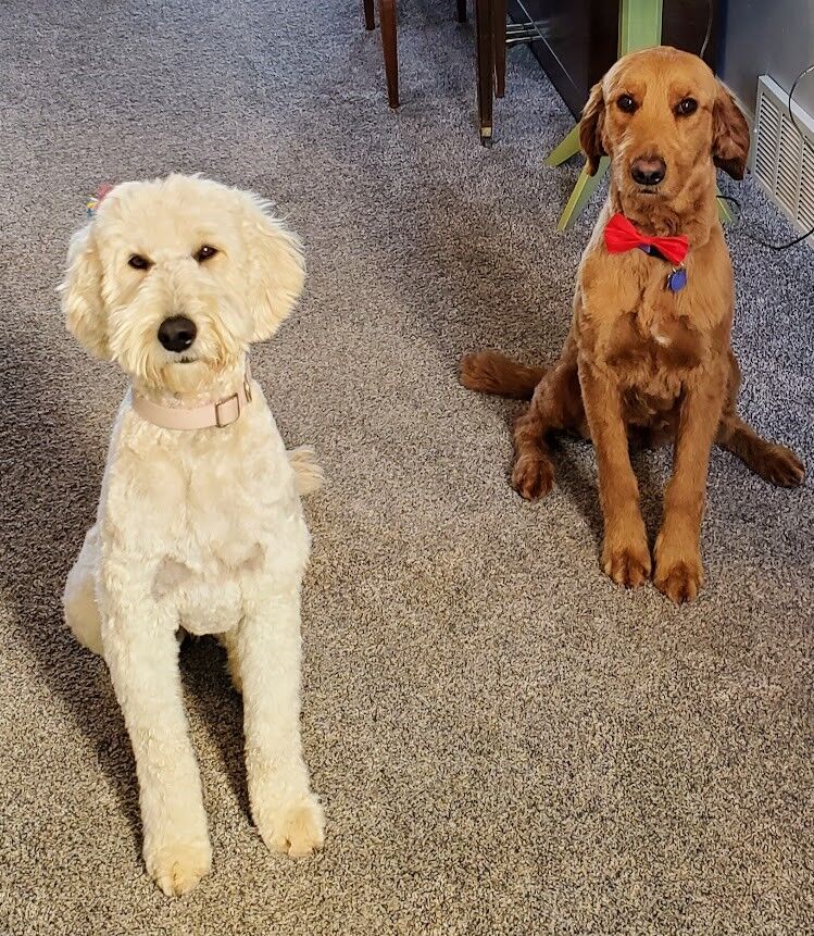 Are these purebred? No! They are bred for beauty and companionship! Dad is a genetically tested super sweet and active Aussie Collie 50-50 mix. He loves outdoor adventures, tug o war and fetch. Very obedient and fun - tons of personality. Mom is also tested and is an F1B (3/4 poodle and 1/4 Retriever) white Goldendoodle who is incredibly athletic and strong. She also loves adventures but is also content to lay at your feet or on your lap if you let her.