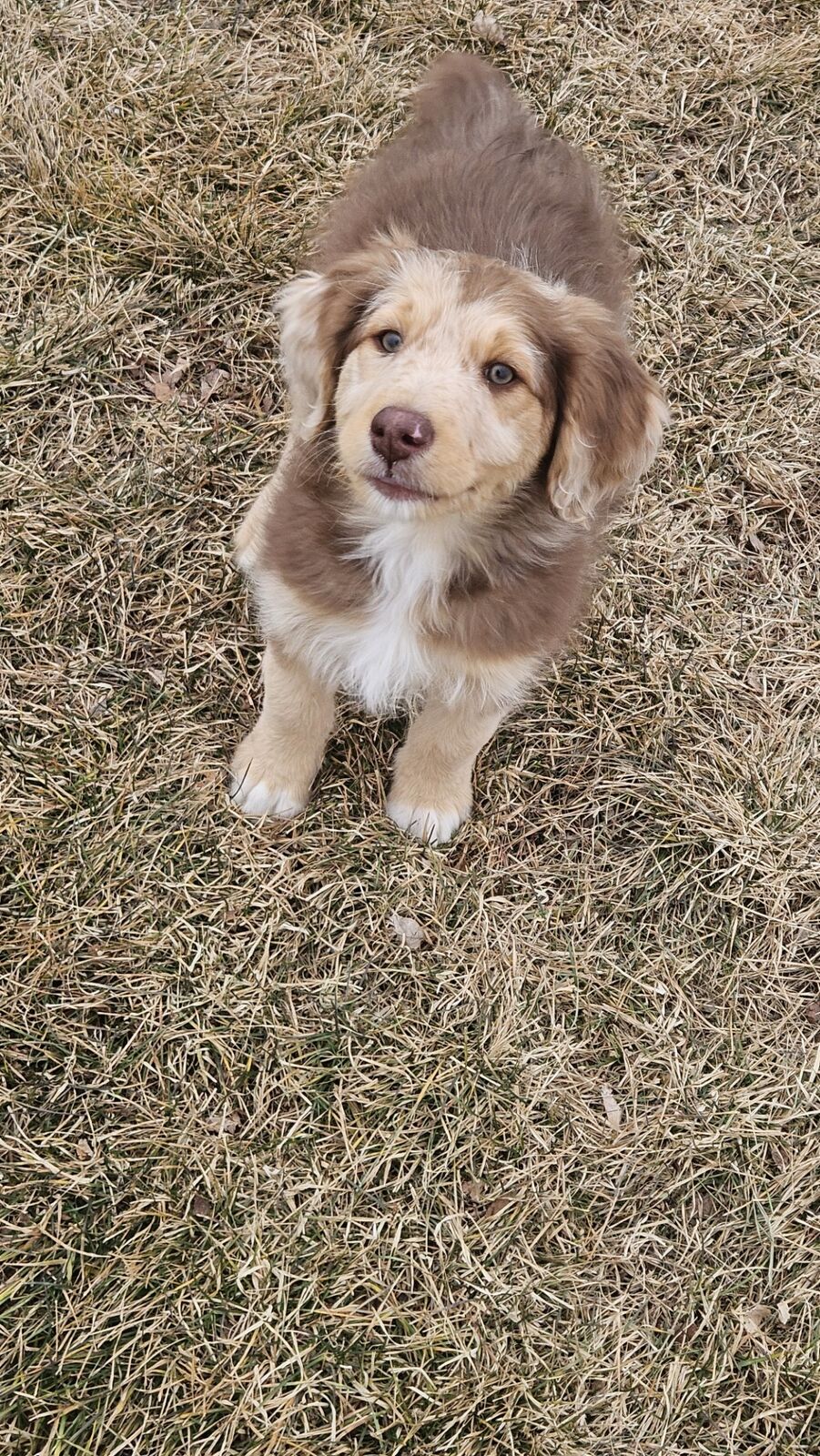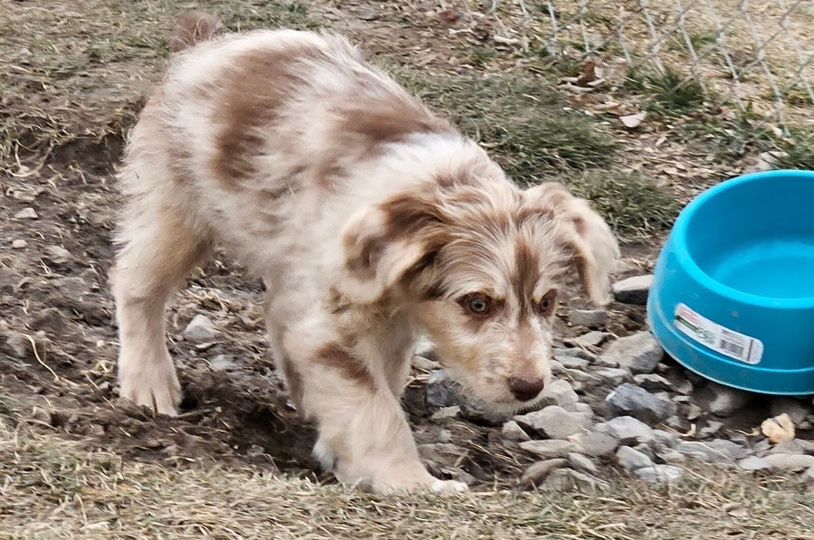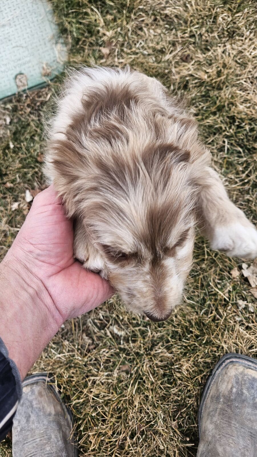 HOMED! - FROST - he is one of the two darker red merles. If you can see his face, he has a snout that is half red and half white right down the middle. He is a little more timid and calm. He may end up being one of the calmer ones in the litter - preferring to stay close