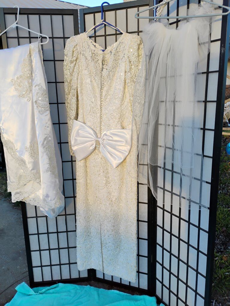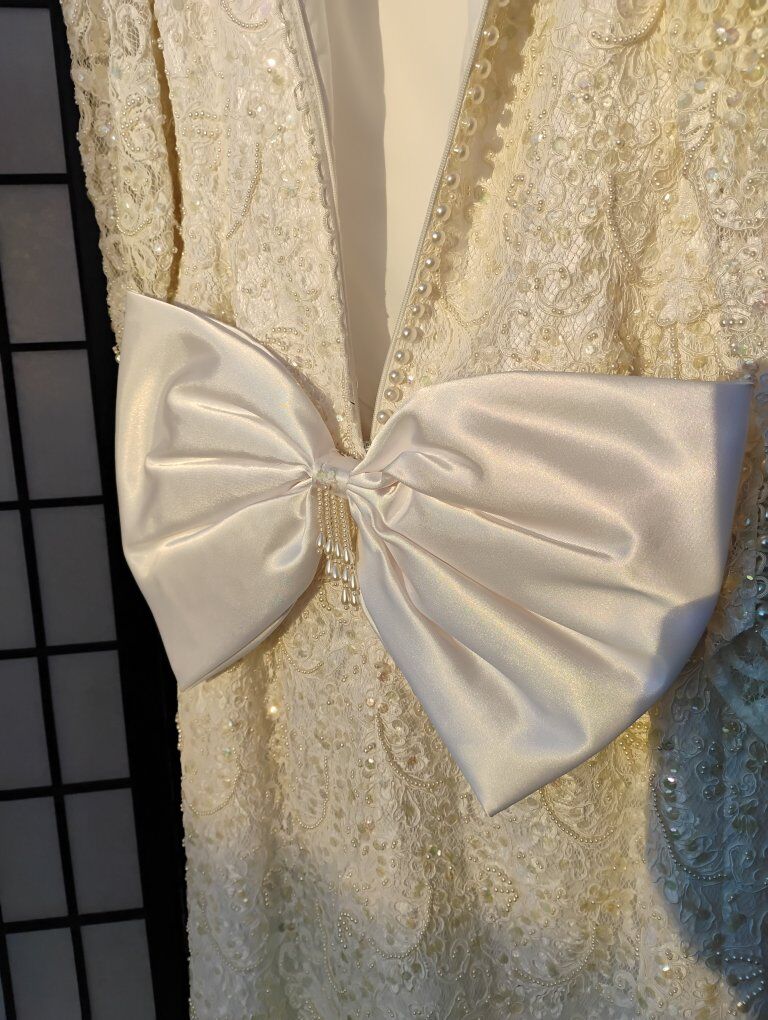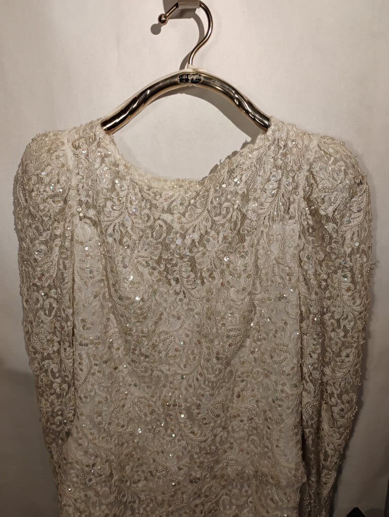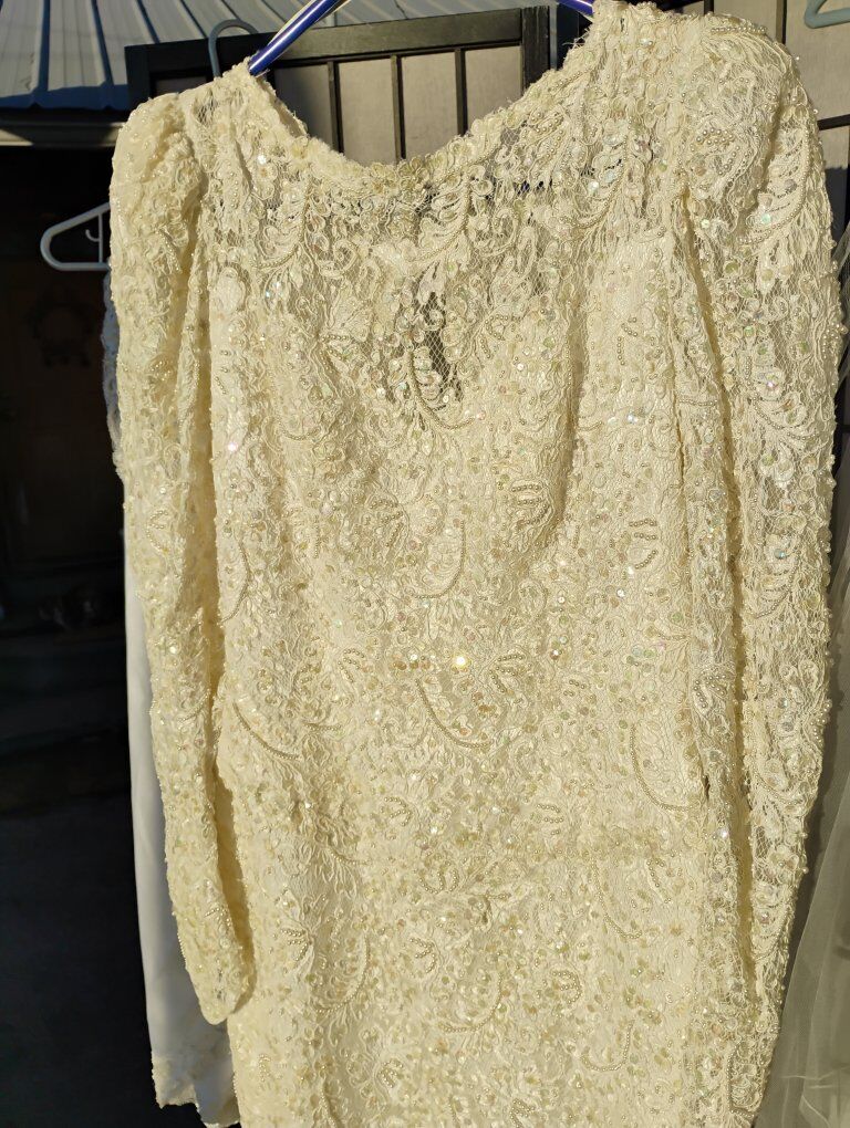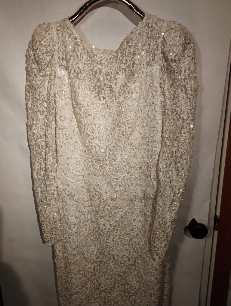 VenmoAbsolutely gorgeous Sweetheart Gowns 1980s dress. Size 10. Off White. Great vintage condition with train veil and headpiece. Sequin's ,beads and pearls run the length of the dress front and back see all pictures. Large silk bow on the back. Long sleeve slender cut. A must see in person, pictures don't do it justice. Looks yellow in some pics. it's not.