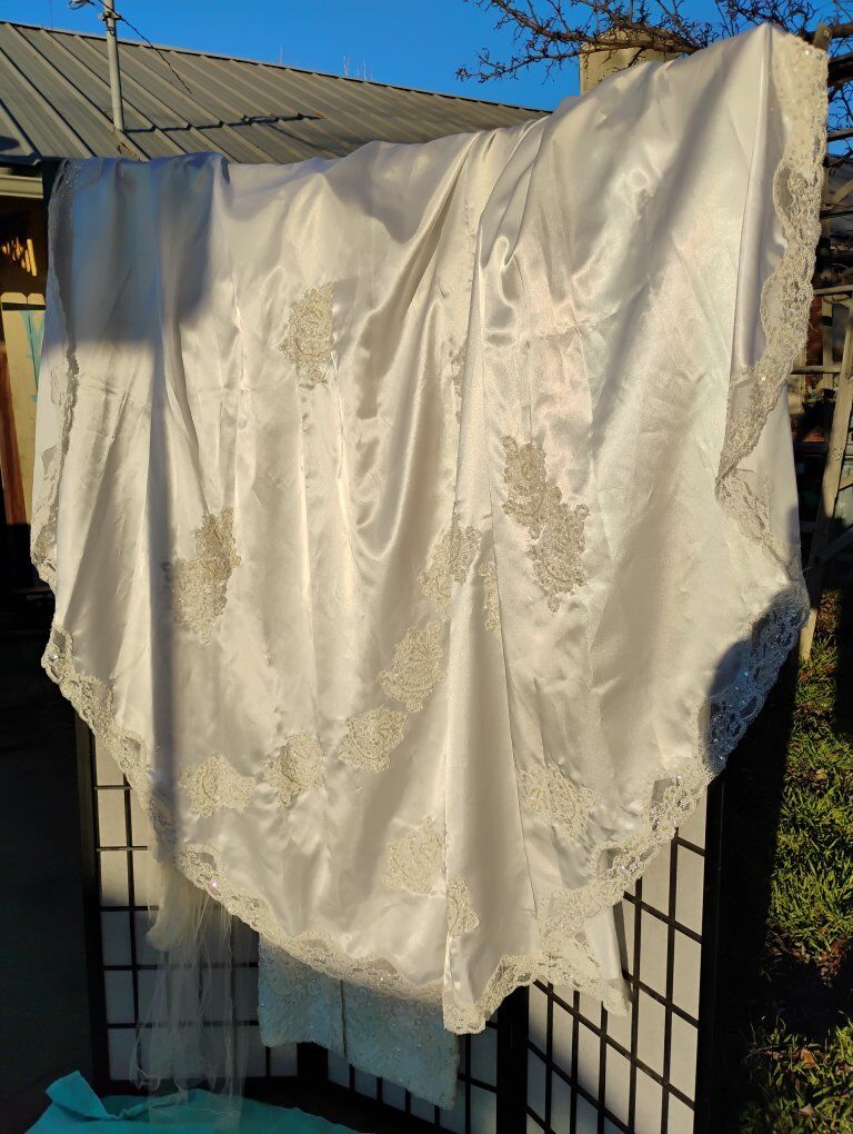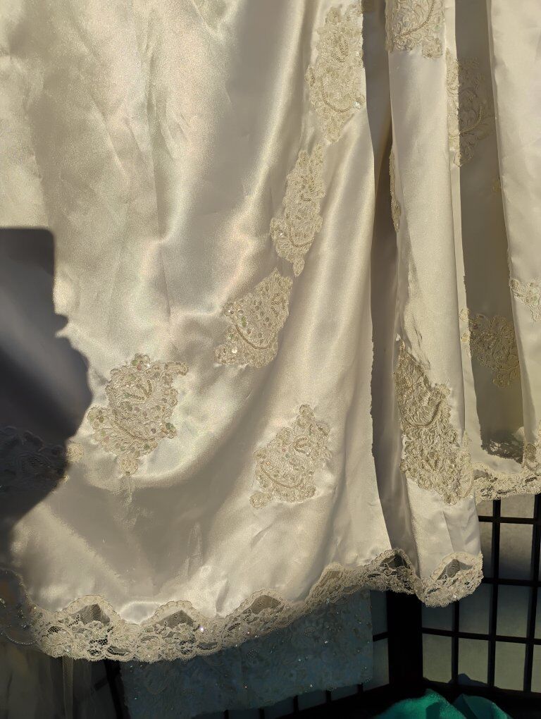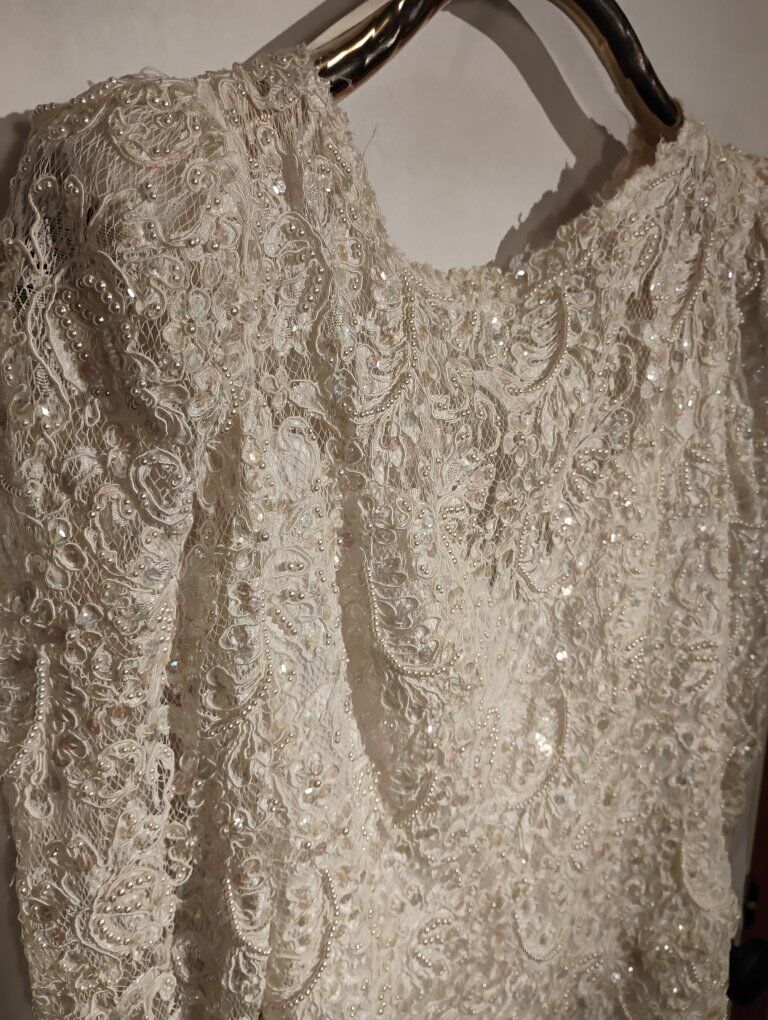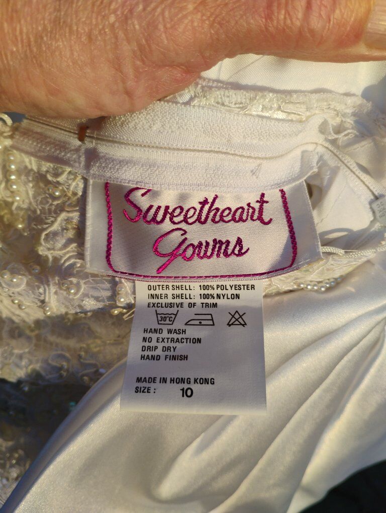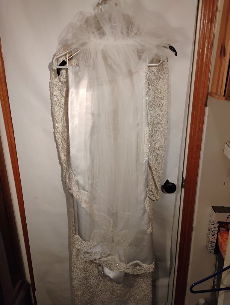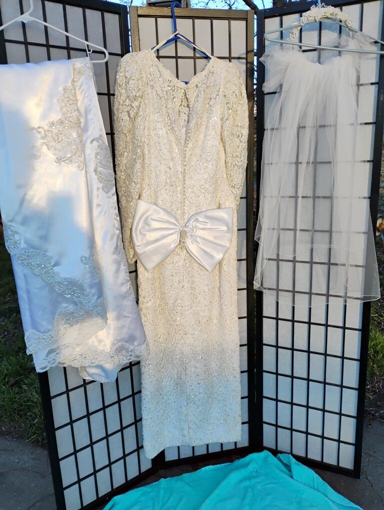 VenmoAbsolutely gorgeous Sweetheart Gowns 1980s dress. Size 10. Off White. Great vintage condition with train veil and headpiece. Sequin's ,beads and pearls run the length of the dress front and back see all pictures. Large silk bow on the back. Long sleeve slender cut. A must see in person, pictures don't do it justice. Looks yellow in some pics. it's not.