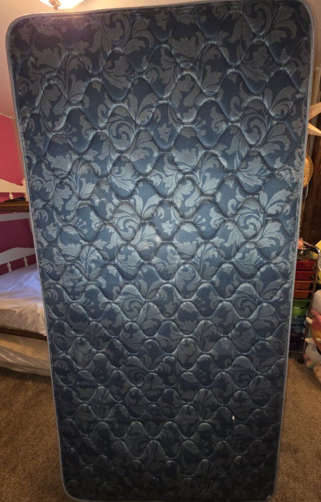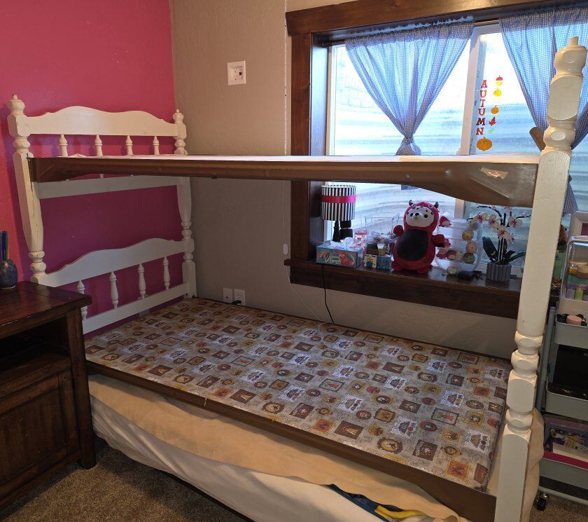 Twin bunk bed with mattresses. Can be used as bunk bed or singles. Mattress are clean. Has rail for one side of top bunk. Head and foot boards have been reinforced with metal angle brackets. We have used this as a bunk for 12 years.