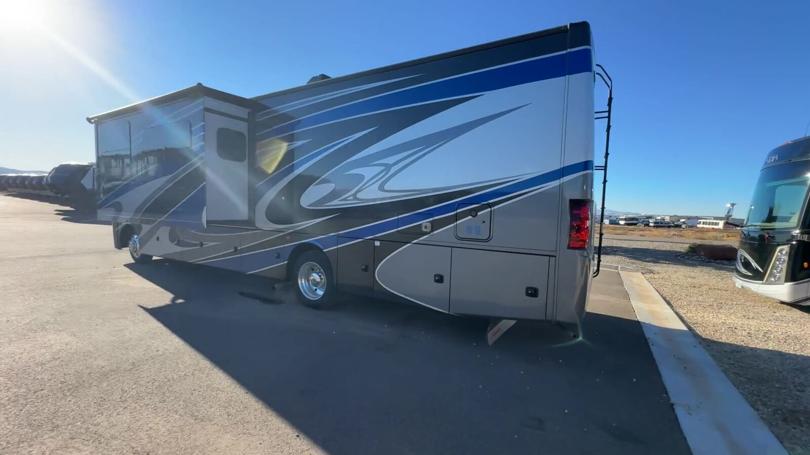 Thor Motor Coach Miramar Class A gas motorhome 35.2 highlights: Full-Wall Slide Residential Refrigerator Swivel Captain's Chairs Full Bath Rear Private Bedroom Drop-Down Overhead Bunk Make yourself at home in this double slide out coach! When you arrive at your destination, set up the the 20' power awning with LED lights and enjoy the 39" exterior TV. You can prepare lunch on the two burner single induction cooktop, or use the stainless steel convection microwave, and there is a Dream Dinette to dine at. You'll also find 67" theater seating across from the retractable 49" LED TV to watch your favorite shows. You're going to love the rear bedroom with its Tilt-A-View inclining king bed that will allow you to read a book in bed, plus there is a 32" TV and a closet to store your belongings. And this coach wouldn't be complete without stackable washer and dryer prep! With any Miramar Class A gas motorhome by Thor Motor Coach you will find a durable welded tubular aluminum roof and sidewall cage construction, rotocast storage compartments, and frameless windows for a more sleek look. The 100-watt solar charging system with a power controller will allow you to do some off-grid camping, and you'll have an Onan RV QG 5500 gas generator on board for all your power needs. Each model includes the Rapid Camp+ multiplex wiring control system for quick and easy set up, and the Winegard ConnecT WiFi extender +4G will be perfect if you need to telecommute. Inside you'll find residential vinyl flooring, leatherette furniture, plus satin finish cabinetry with solid wood flat panel cabinet doors and nickel finish hardware for a truly luxurious coach!