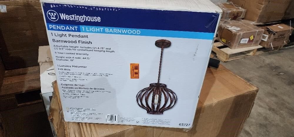 This Westinghouse Farah pendant's barnwood finish adds a rustic natural touch to this geometric design. Soft, filtered light throws patterns on surrounding surfaces when one or more are suspended above a kitchen island or breakfast bar. Westinghouse is a trusted, global brand. Westinghouse knows lighting and offers products with exceptional quality, reliability and functionality. Product reference number 63727. For an energy-efficient alternative, use one 60-watt equivalent Westinghouse LED light bulb (sold separately)
