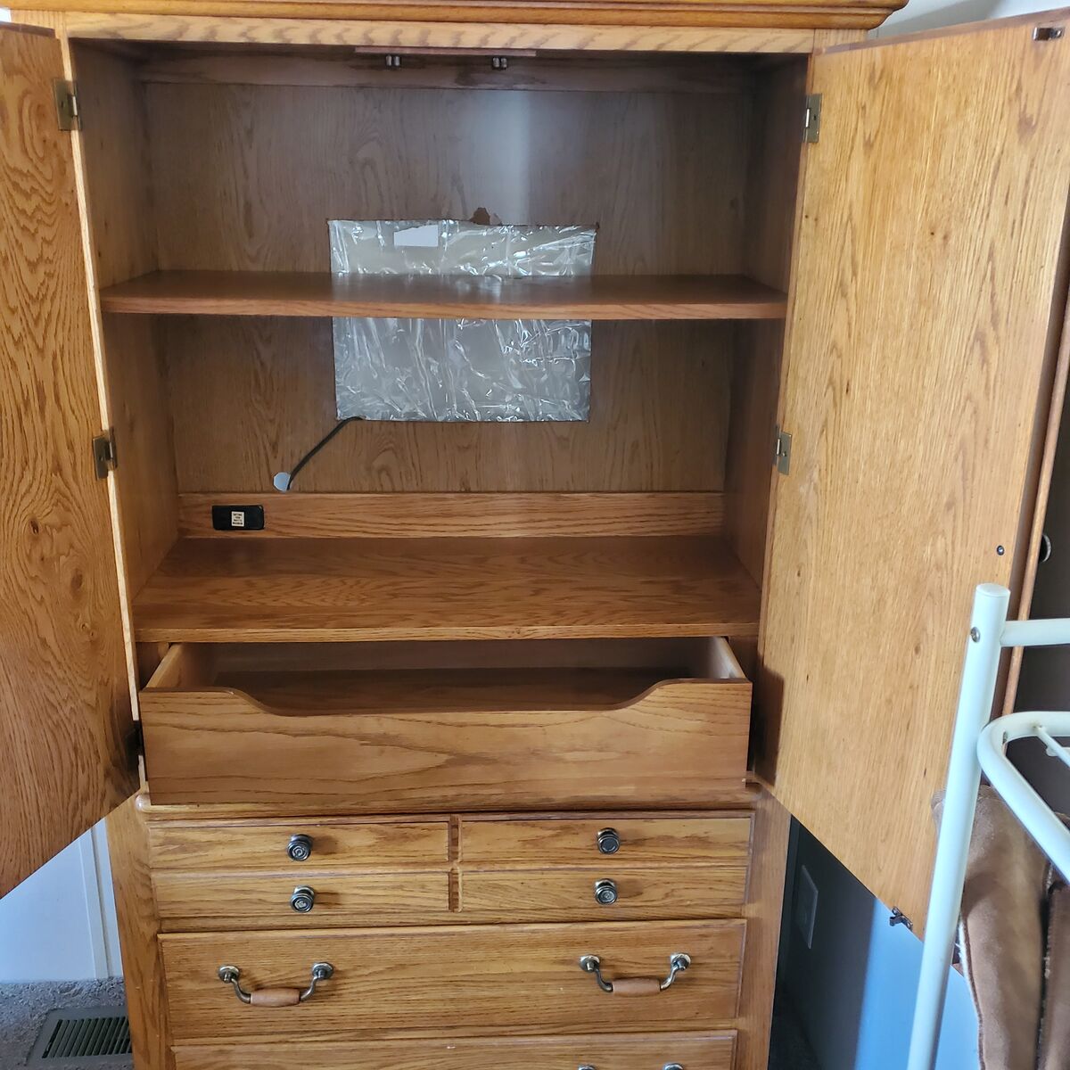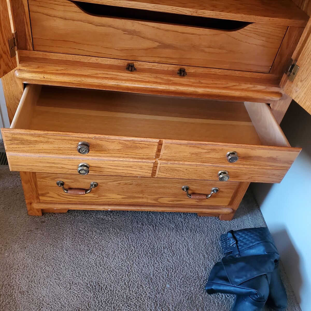 Venmosolid oak, good construction. Blonde finish. Add $50.00 for delivery. ask for Tim