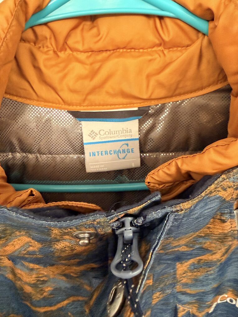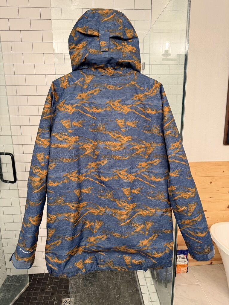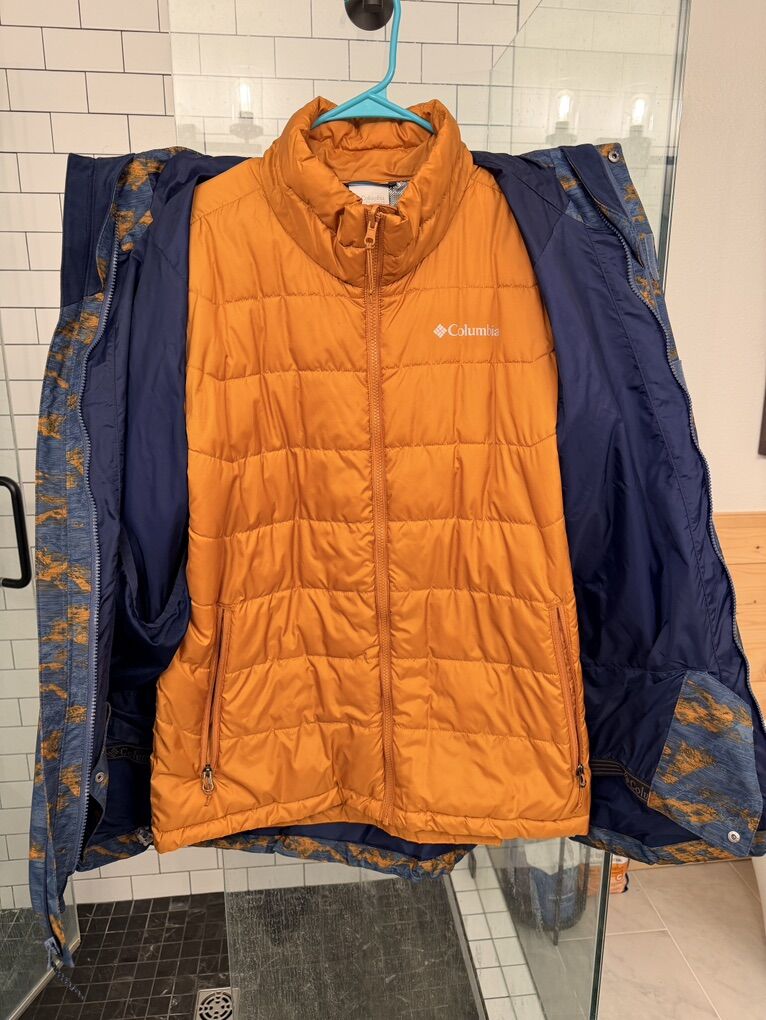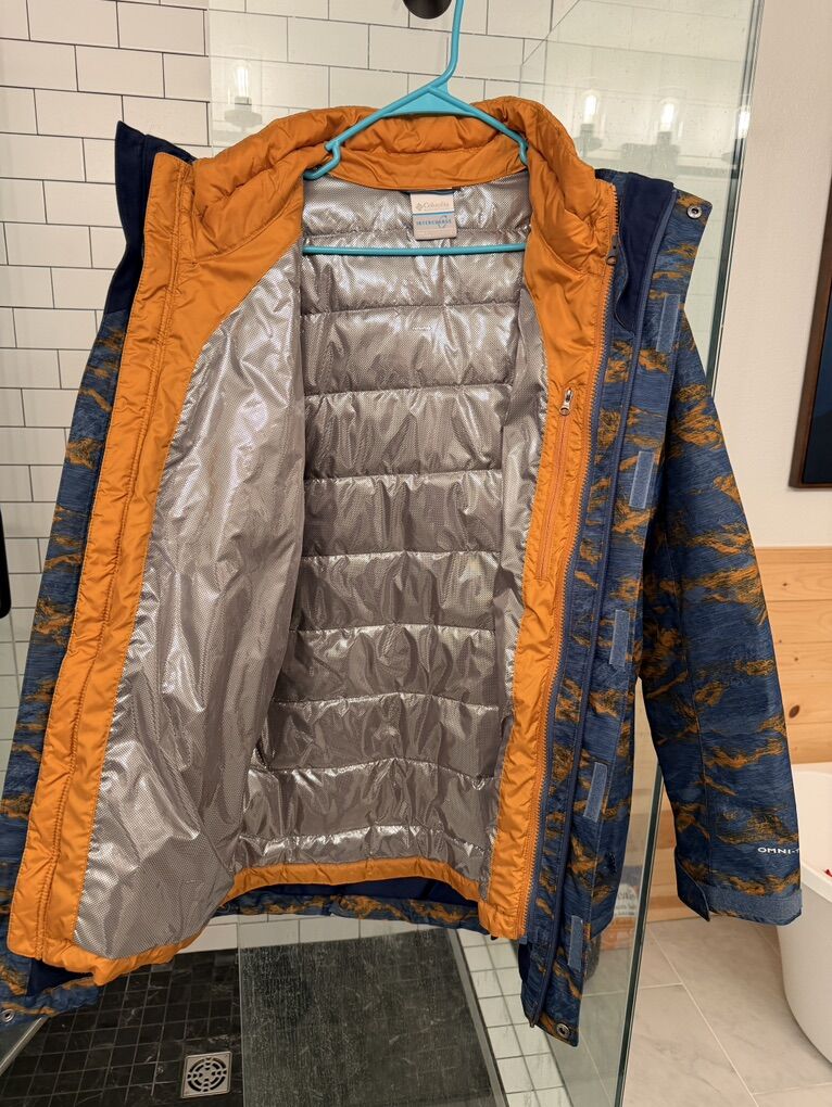The inner jacket is an orange Columbia puffer with a reflective lining and recycled polyester filling. It has hip pockets and an internal pocket. The outer coat has a hood adjustment tab, Velcro cuffs, an elastic waist cinch, zipper pockets, and a snow skirt to prevent snow from getting in.