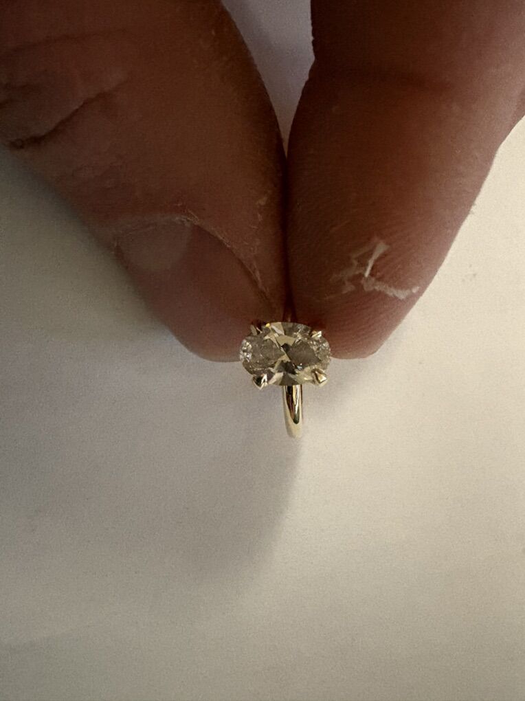 This is a beautiful ring, in excellent condition. It was recently cleaned, and is a little over a year old. It is a lab grown diamond, with an oval brilliant cut. Diamond is a grade D color and a VS 1 clarity. The band is yellow gold, and is size 4.5. I purchased this ring in November 2024 at Ingrams Fine Jewelers in Idaho Falls. I’m selling it because I am no longer married. The original paperwork got lost, but I have a copy of the diamond verification report and I’d be happy to meet at Ingrams for another verification.