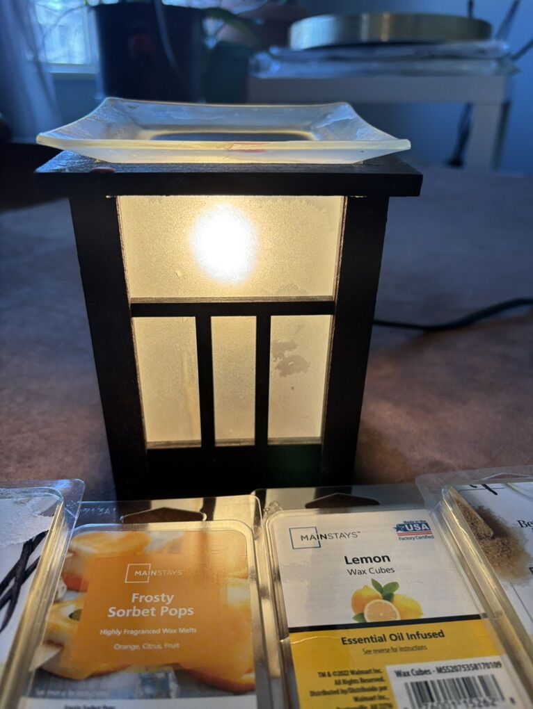 Asian inspired wax burner brown with frosted glass panels. Works great I just don’t have room for it comes with three unopened sets of wax. Cash only please