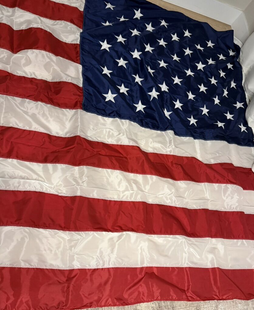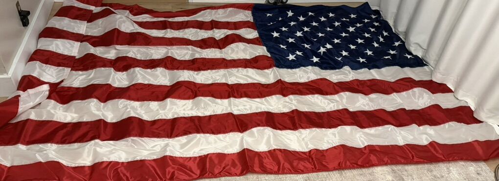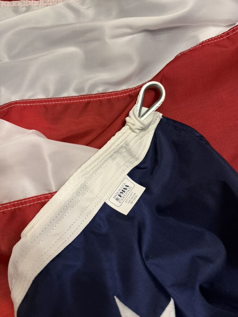 8x12ft. Durawavez Nylon US flag is fully sewn of 100% nylon with embroidered stars and sewn stripes, finished with a rope header and galvanized metal thimbles.