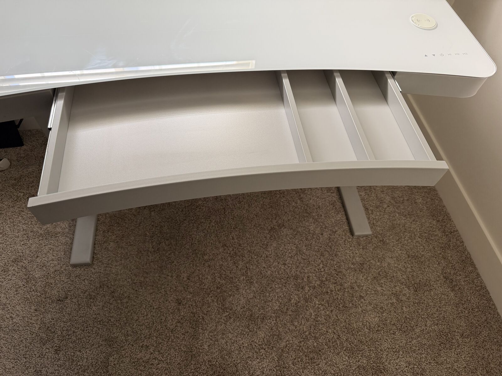Venmohi! originally purchased this for $275 at costco! it has a glass top and a spacious drawer! this has different height settings and a timer. i included a video of it the wireless phone charging pad on it, and i also have a video of the desk going up and down if you would like me to send that to you! the thing that's "wrong" with it is the rubber part of the phone charger pad got damaged when we oved but it still charges (proof in the video)! text me - 435-695-4916 Shayna