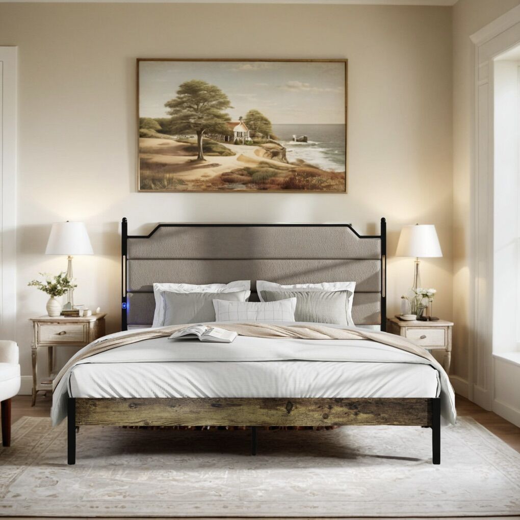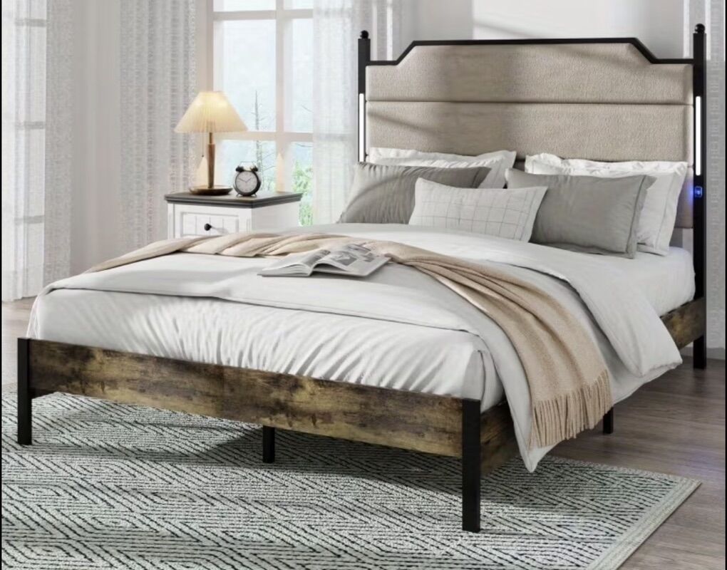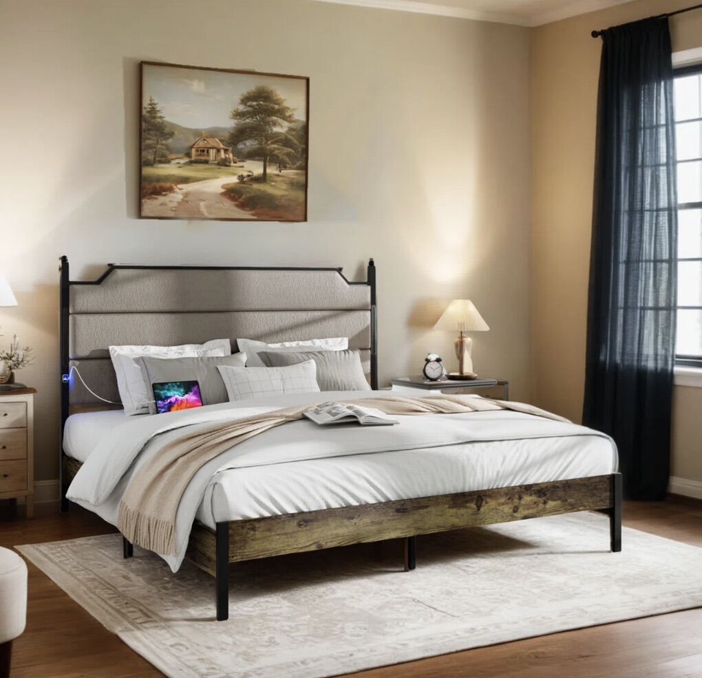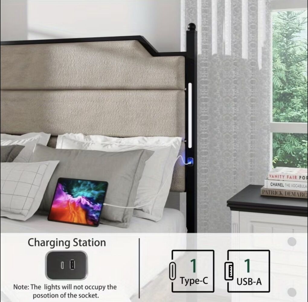 ️ Extra-tall 53.15” padded headboard for comfort and style ️ Built-in USB & USB-C charging ports for easy bedside charging ️ Adjustable LED lighting for ambiance, reading, or nighttime use ️ Strong wood frame — no box spring required