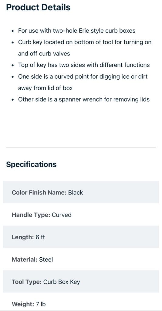 Description- 6’ Long curb key with curved handle. See photos for more product information and specifications.