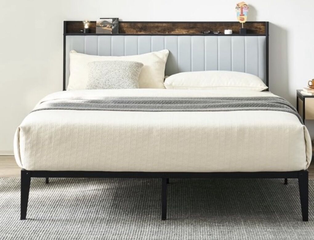 ️ Padded headboard with built-in storage shelf for easy bedside organization ️ Strong metal frame — no box spring required