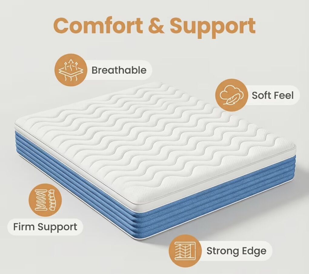 Hybrid design: memory foam + pocket springs Cool, breathable & motion-reducing for better sleep Fits any queen bed frame — no box spring needed CertiPUR-US® certified materials
