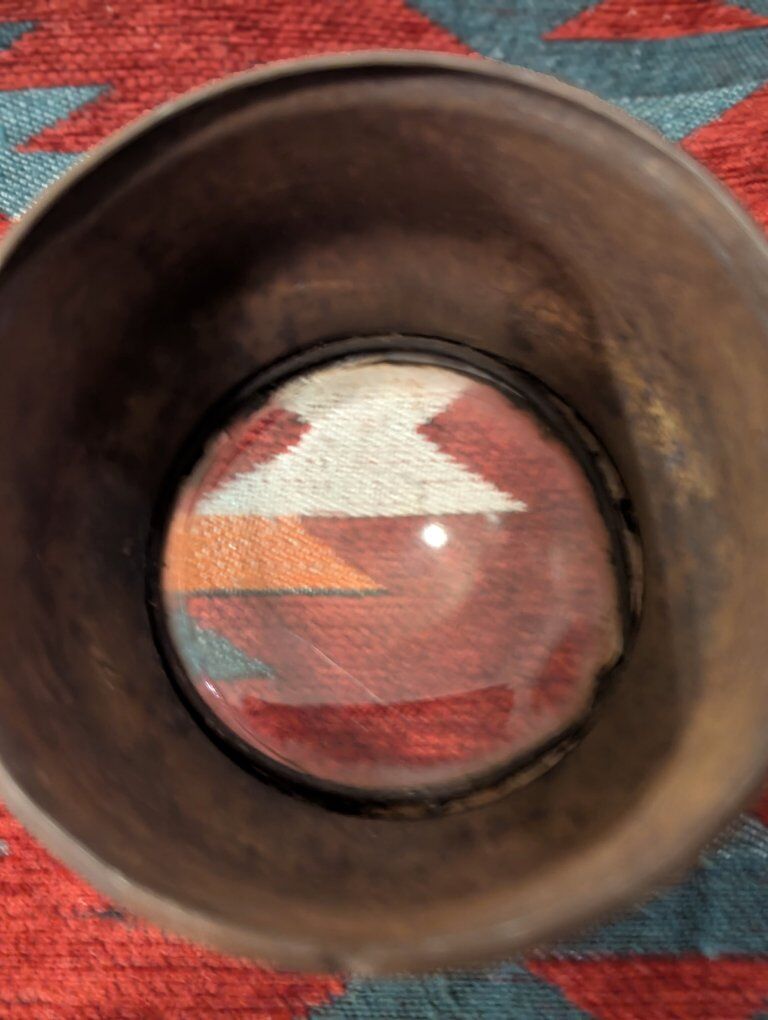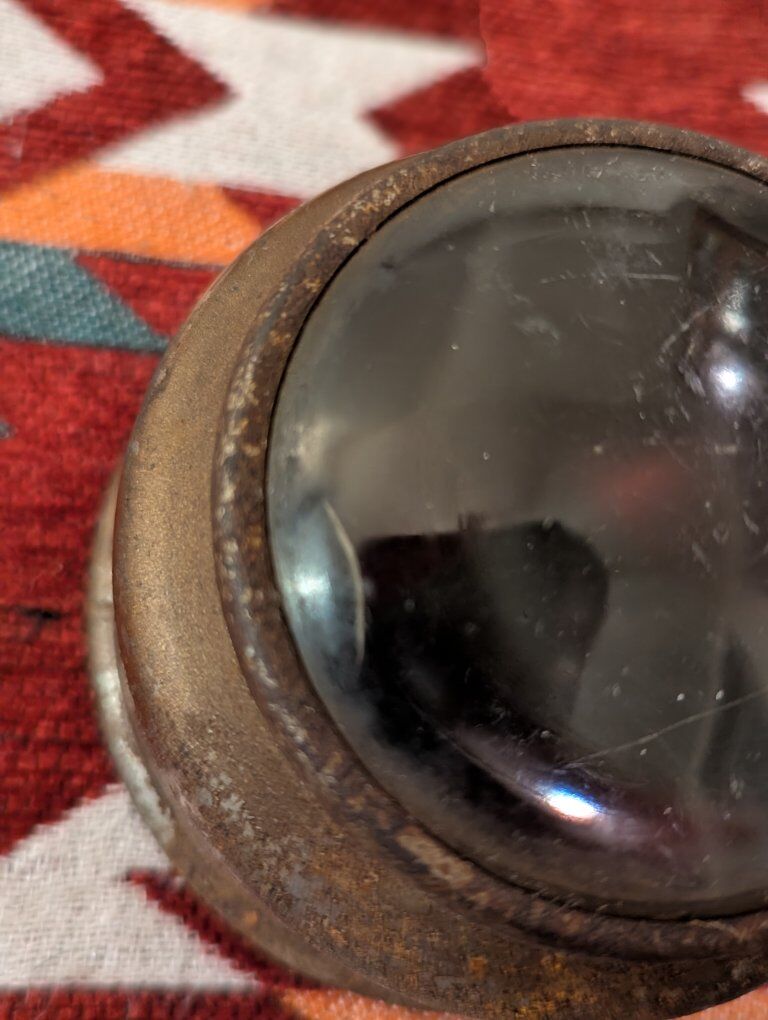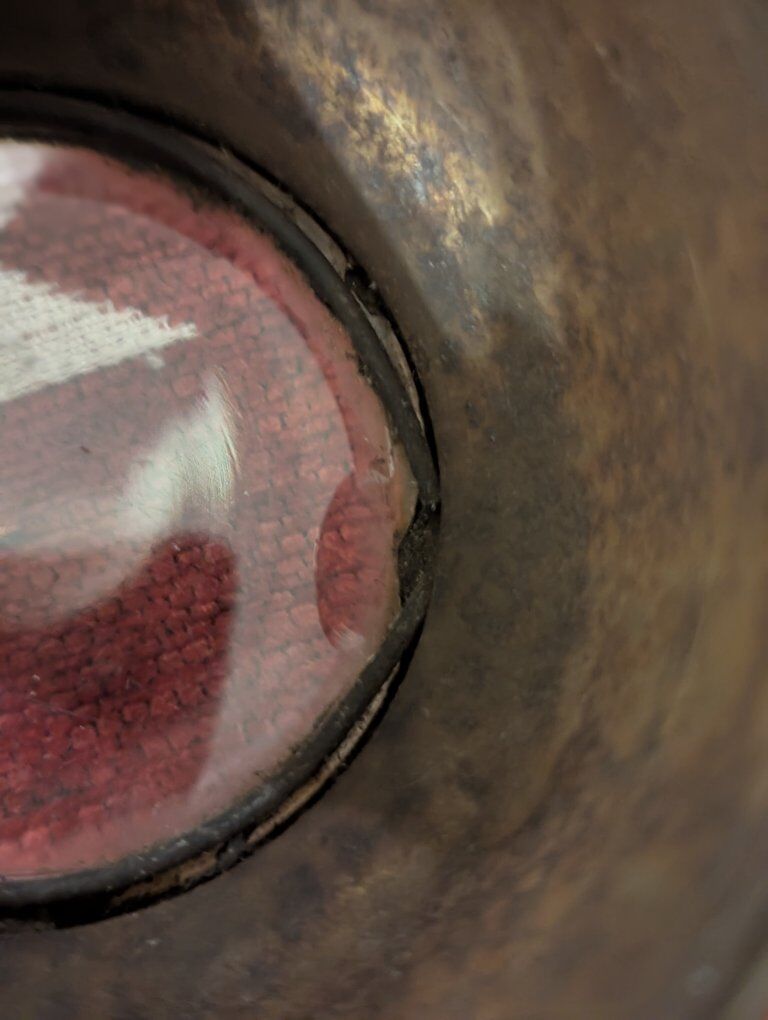 The Brass Era Automobile Cowl / Side Lamp Lens Assembly from c. 1905–1918 features a convex glass design. This vintage car part is a crucial component for lighting and visibility on classic automobiles from the early 20th century. With its brass construction and unique convex glass, this assembly not only provides illumination but also adds a touch of nostalgia to any vehicle restoration project. Has a small, hardly noticeable chip on the inside inner rim of the glass. Possibly for a Model A or Model T.