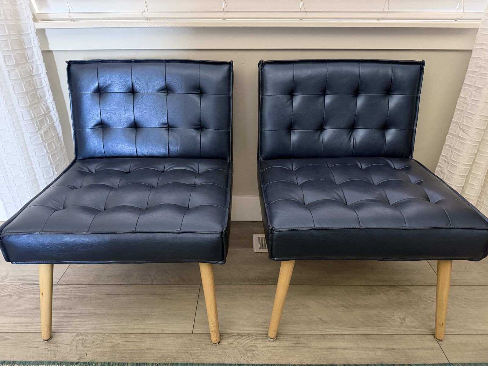 VenmoThis is a Set of 2 OSP Home Furnishings Tufted Faux Leather Armless Accent Chairs (Azure Blue). They are a fun vibrant blue color. They measure: 30.75" H x 25" W x 27.25" D. They have solid light wood legs. They are very comfortable, and the faux leather makes for easy cleanup. They are the perfect accent to any room, bedroom, family room, living room or office. They are small and easy to decorate any room while also adding extra seating.
