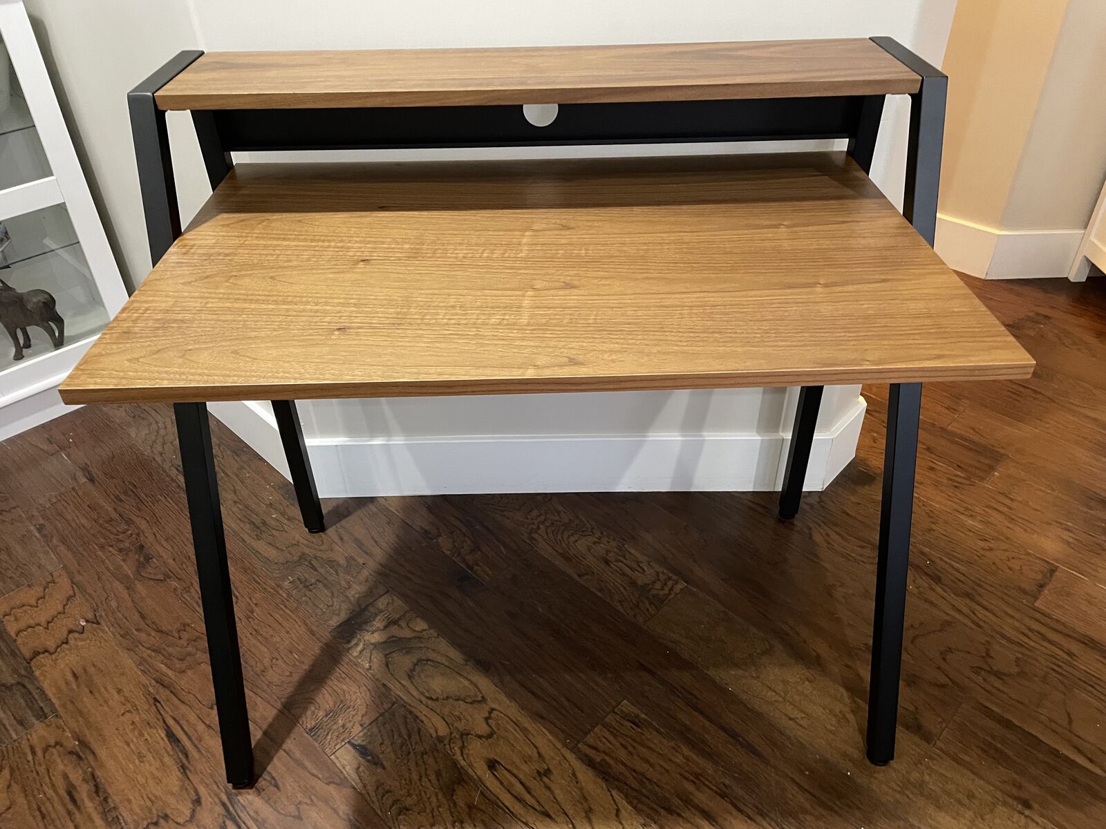 Simple industrial-style design 2-level work area Generous writing surface with room for a laptop or tablet Upper shelf for additional items Access point for cable management This sleek and stunningly simple writing desk offers two levels of work areas and a modern, space-saving design, making it a great option for the office, home or dorm room. The industrial-style desk features a generous writing surface with room for a laptop or tablet and other essentials, an access point for cable management and an upper shelf for smaller items. Width37.75 in